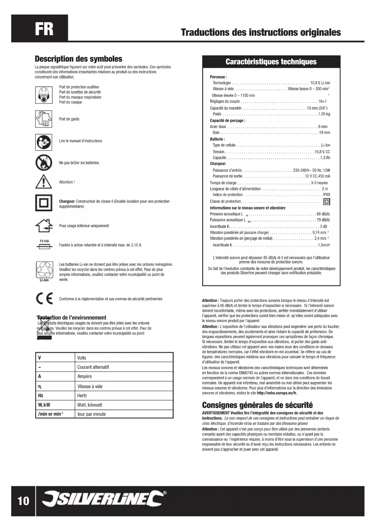 Incertitude K............................................ 1,5m/s² L’intensité sonore peut dépasser 85 dB(A) et il est nécessaire que l’utilisateur prenne des mesures de protection sonore.Du fait de l’évolution constante de notre développement produit, les caractéristiques des produits Silverline peuvent changer sans notification préalable. Description des symboles La plaque signalétique figurant sur votre outil peut présenter des symboles. Ces symboles constituent des informations importantes relatives au produit ou des instructions concernant son utilisation. Port de protection auditive Port de lunettes de sécurité Port du masque respiratoire Port du casquePort de gantsLire le manuel d’instructions Ne pas brûler les batteriesAttention !Chargeur: Construction de classe II (Double isolation pour une protection supplémentaire)Pour usage intérieur uniquementFusible à action retardée et à intensité max. de 3,15 A.Les batteries Li-ion ne doivent pas être jetées avec les ordures ménagères. Veuillez les recycler dans les centres prévus à cet effet. Pour de plus amples informations, veuillez contacter votre municipalité ou point de vente.Conforme à la réglementation et aux normes de sécurité pertinentes Protection de l’environnement Les produits électriques usagés ne doivent pas être jetés avec les ordures ménagères. Veuillez les recycler dans les centres prévus à cet effet. Pour de plus amples informations, veuillez contacter votre municipalité ou point de vente.Li-ion T-130˚ T3.15A V Volts ~ Courant alternatif A Ampère