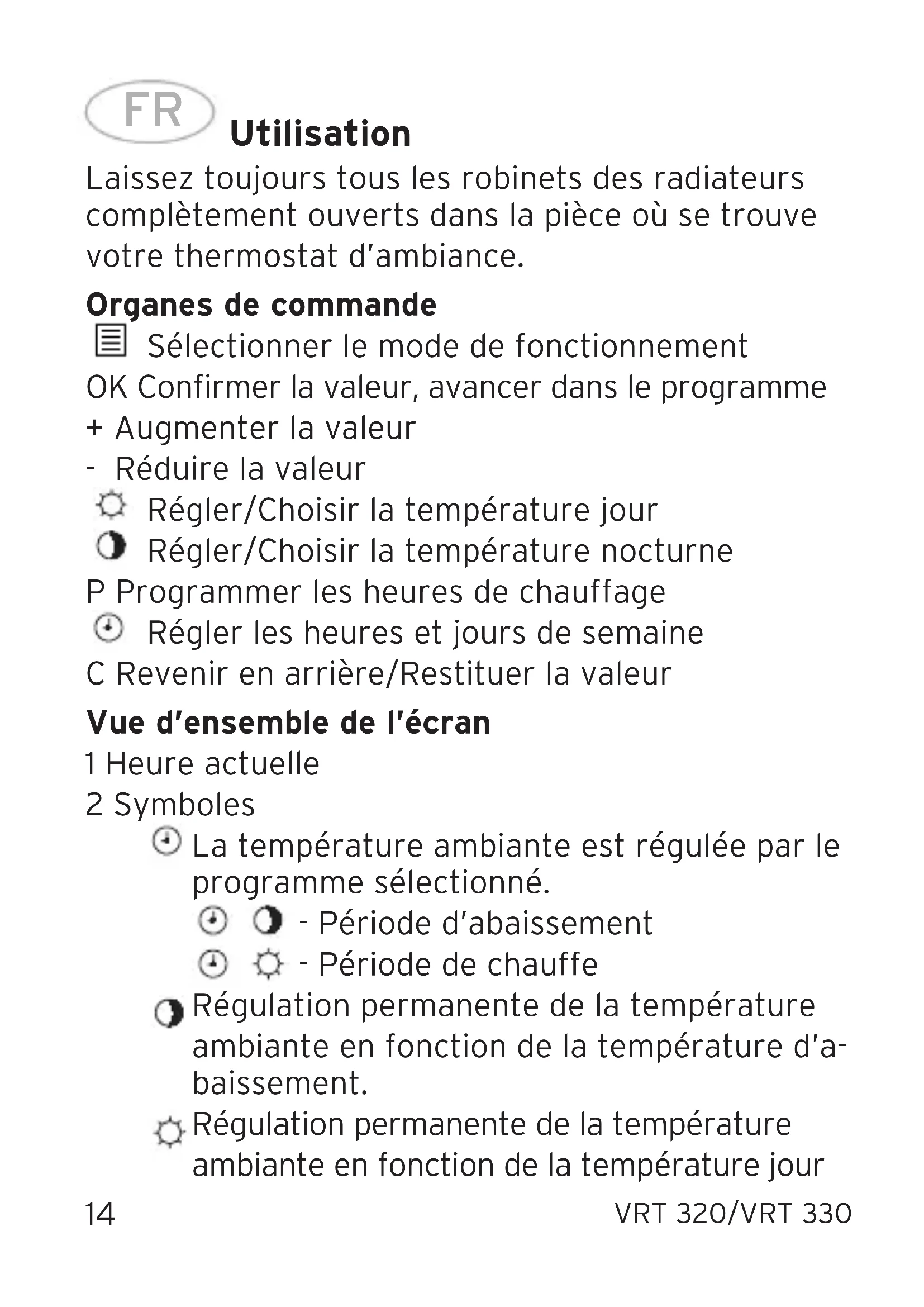 Utilisation Laissez toujours tous les robinets des radiateurs complètement ouverts dans la pièce où se trouve votre thermostat d’ambiance. Organes de commande Sélectionner le mode de fonctionnement OK Confirmer la valeur, avancer dans le programme + Augmenter la valeur - Réduire la valeur Régler/Choisir la température jour Régler/Choisir la température nocturne P Programmer les heures de chauffage Régler les heures et jours de semaine C Revenir en arrière/Restituer la valeur Vue d’ensemble de l’écran 1 Heure actuelle 2 Symboles La température ambiante est régulée par le programme sélectionné. - Période d’abaissement - Période de chauffe Régulation permanente de la température ambiante en fonction de la température d’a- baissement. Régulation permanente de la température ambiante en fonction de la température jour FRVRT 320/VRT 330