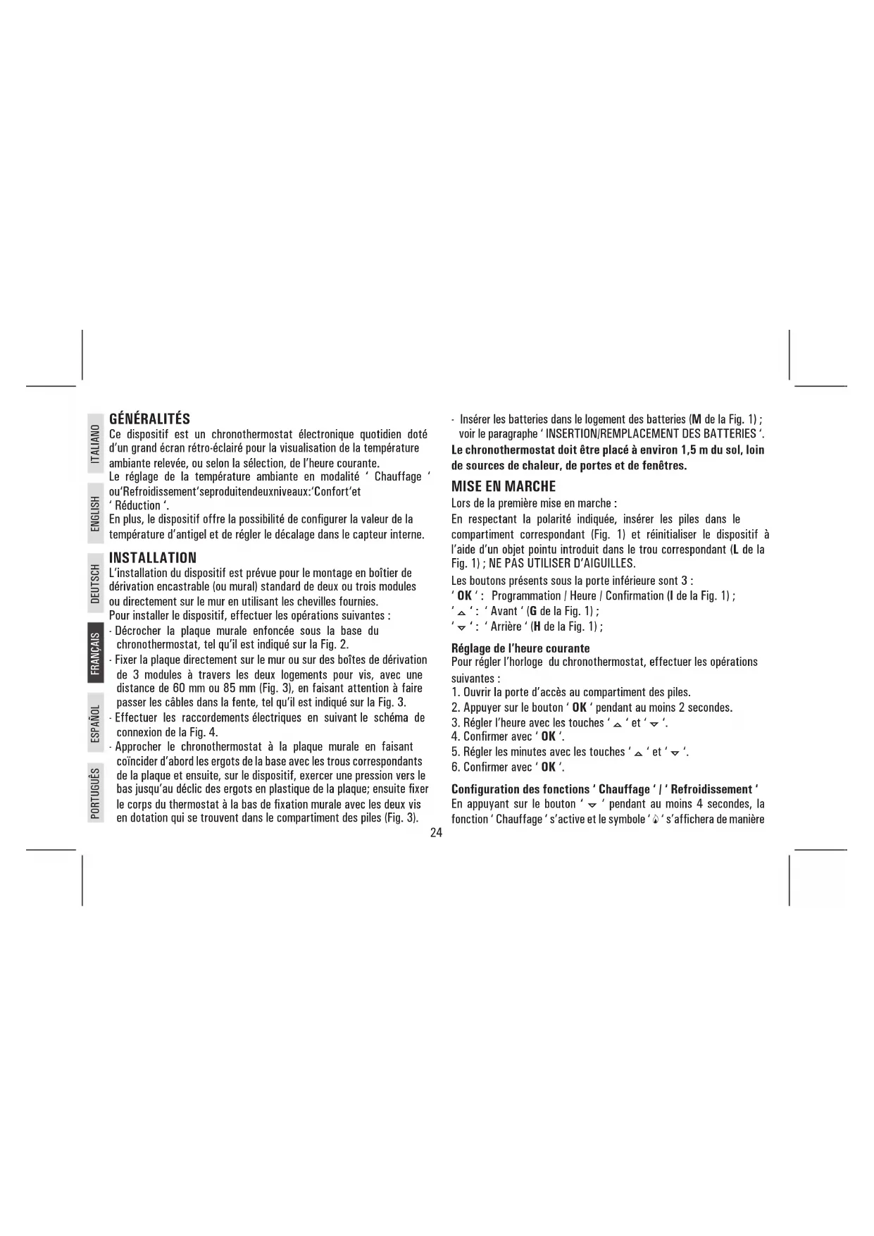 En respectant la polarité indiquée, insérer les piles dans le compartment correspondant (Fig. 1) et réinitialiser le dispositif à l'aide d'un object pointu introduit dans le trou correspondant (L de la Fig. 1); NE PAS UTILISER D'AIGUILLES.