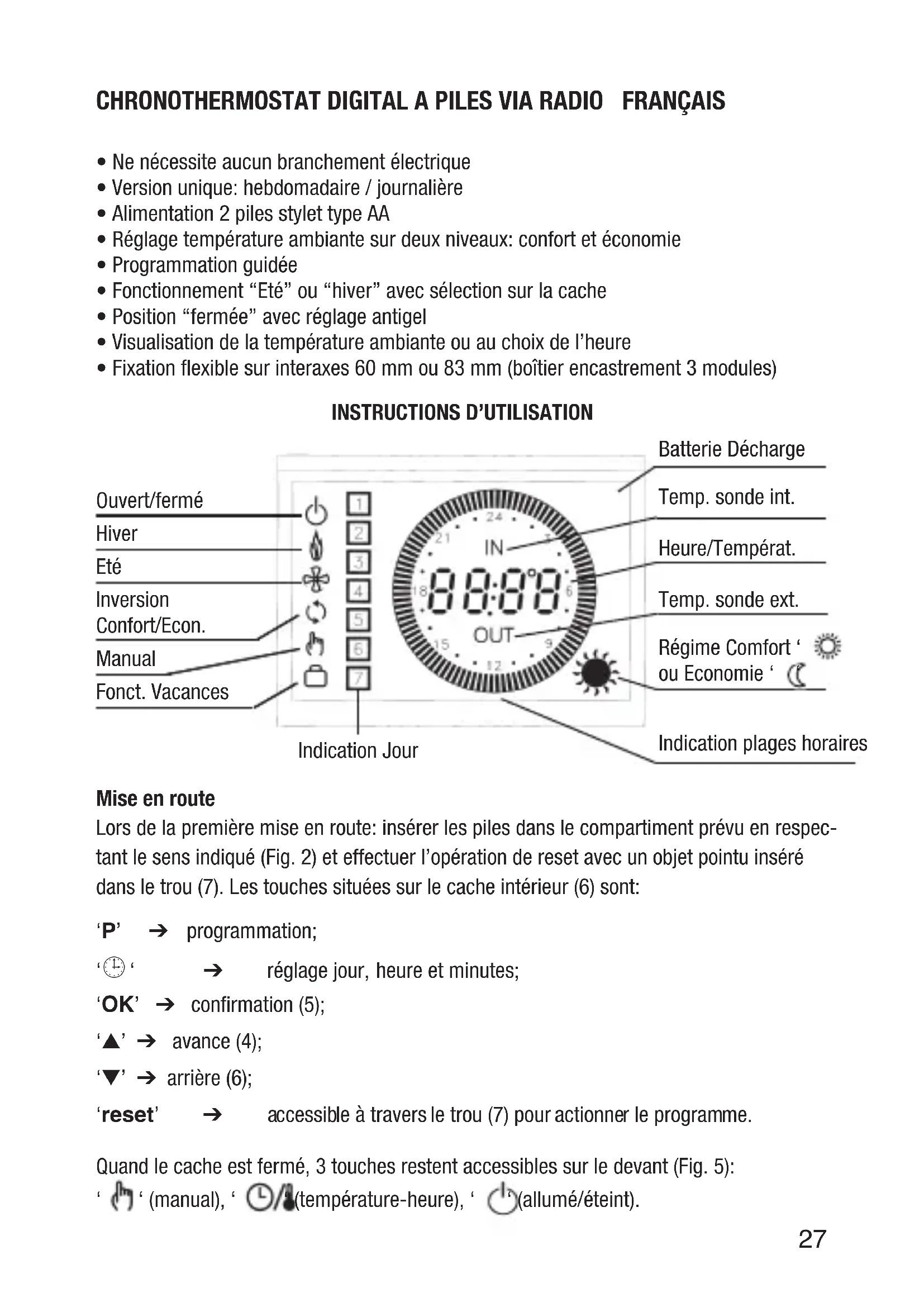 Lors de la première mise en route : insérer les piles dans le compartiment prévu en respectant le sens indiqué (Fig. 2) et effectuer l'opération de reset avec un objet pointu inséré dans le trou (7). Les touches situées sur le cache intérieur (6) sont :