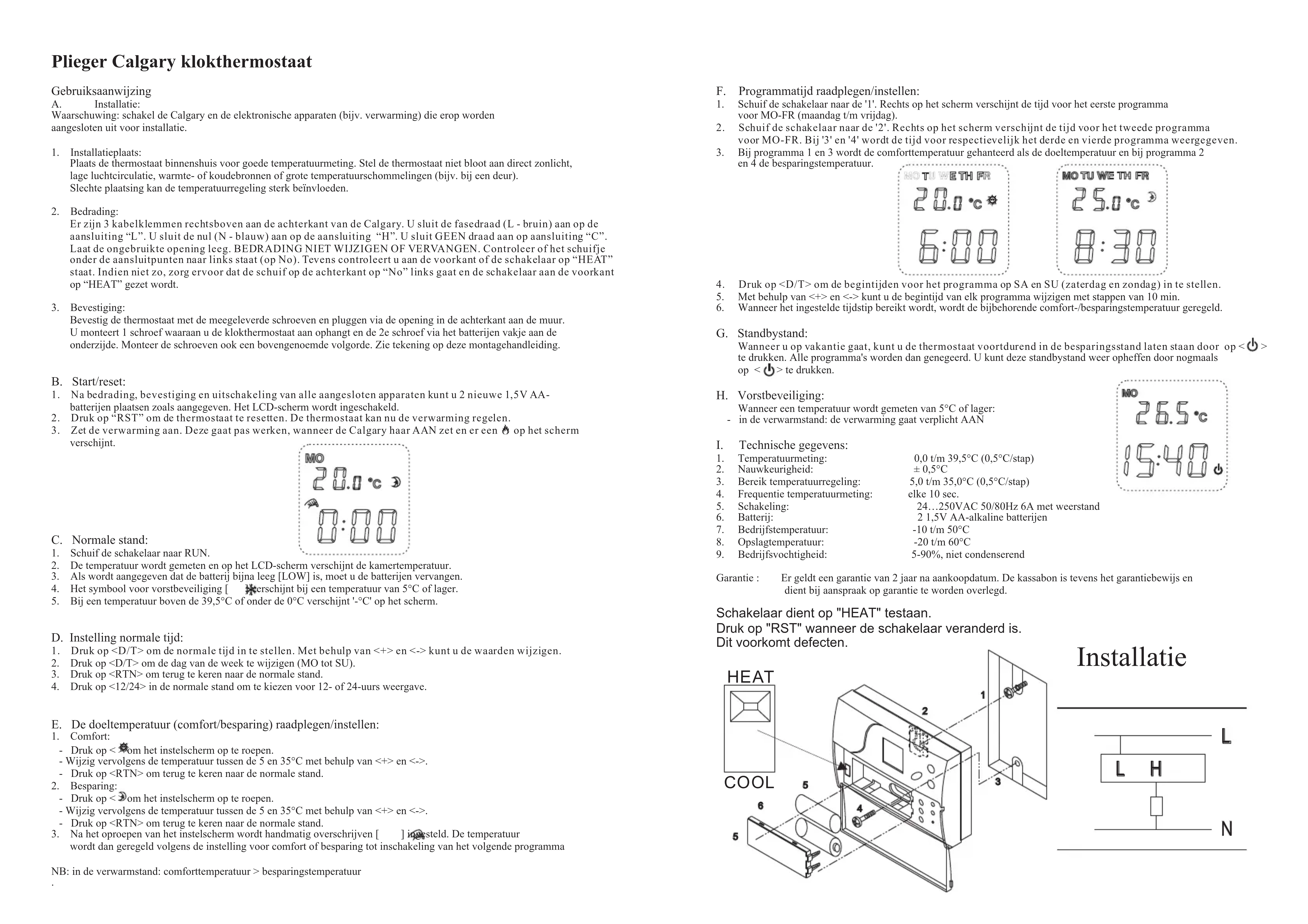 InstallatieChronothermostatCalgaryPlieger Moded'emploi1.Lieud'installation:2. Câblage:3.FixationB.Lancement/réinitialisation:C.Positionnormale:D.Réglagedel'heurenormale:E.Consulter/réglerlatempératurevisée(confort/épargne):A.Installation:Avertissement:débranchezleCalgaryetlesappareilsélectroniques(parex.chauffage)quiysontraccordéspoureffectuerl'installation. Placezlethermostatàl'intérieurpourobtenirunebonnemesuredelatempérature.N'exposezpaslethermostatàla lumièredirectedusoleil,àunefaiblecirculationd'air,àdessourcesdechaleurchaudesoufroidesouàdefortes fluctuationsdetempérature(parex.près d'uneporte).Unmauvaisemplacementpeutfortementinfluersurleréglage delatempérature. Ilya3attache-câblesenhautàdroite,àl'arrièredu Calgary.Raccordezlefildephase(L-brun)surleraccordement "L".Branchezlefilnul(N-bleu)auraccordement"H".Nebranchez AUCUNfilsurleraccordement"C".Laissez l'ouverturenonutiliséelibre.NEPASMODIFIEROUREMPLACERLECÂBLAGE. Vérifiezsilecoulisseause trouvesousles pointsderaccordementàgauche(surNO).Contrôlezégalementsurlapartieavantsil'interrupteurse trouvesur«HEAT »(chaleur).Sicen'estpasle cas,veillezàcequelecoulisseausoitplacéàgauchesur«No»surla partiearrièreetàcequel'interrupteursoitréglésur«HEAT »surlapartieavant. Fixezle thermostataumuràl'aidedesvisetdeschevillesfourniesvial'ouverturesurlapartiearrière. Vousmontez1 vissurlaquellevoussuspendezlechronothermostat,puisune2èmevisvialecompartimentdepilesàl'arrière.Montezlesvisdansl'ordresusmentionné. Voirdessindecemanuel.