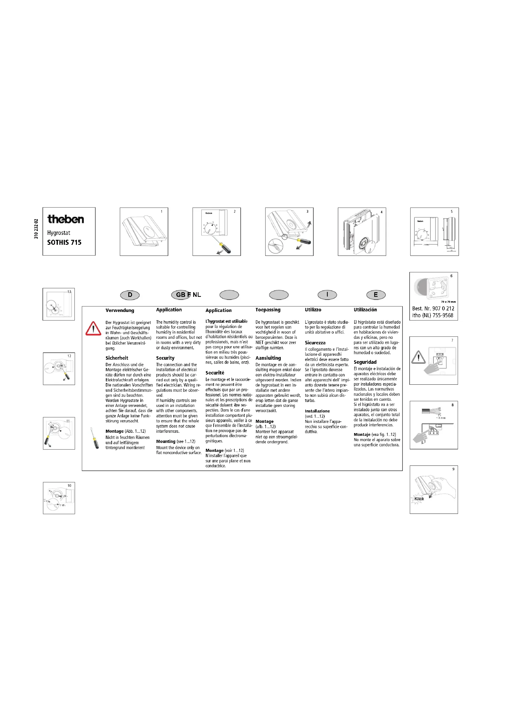 tre res- pectées. Dans le cas d´une installation comportant plu- sieurs appareils, veiller à ce que l´ensemble de l´installa- tion ne provoque pas de perturbations électroma- gnétiques. Montage (voir 1...12) N´installer l´appareil que sur une paroi plane et non conductrice. Best. Nr. 907 0 212 itho (NL) 755-9568 79 x 79 mmD GB F NL