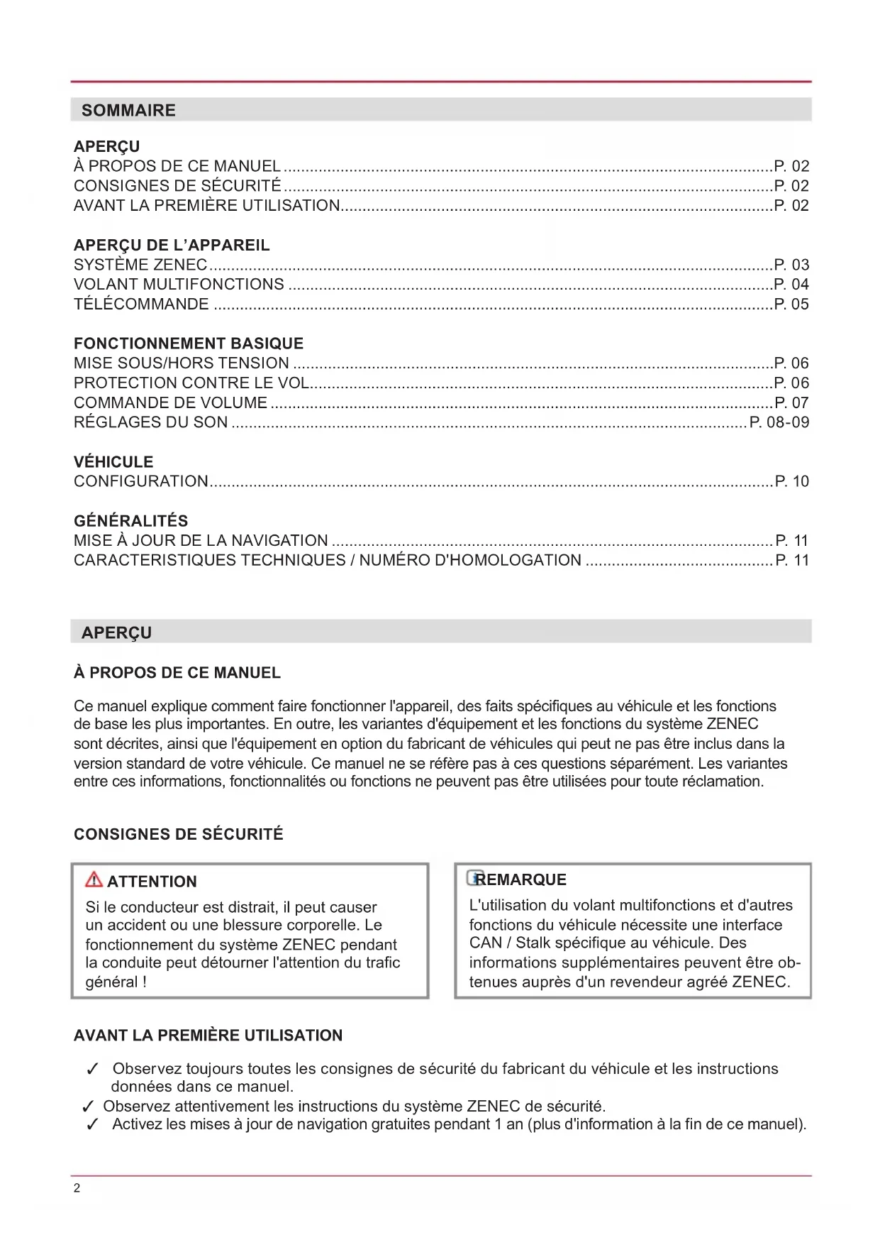 ✓ Observez toujours toutes les consignes de sécurité du fabricant du véhicule et les instructions données dans ce manuel. ✓ Observez attentivement les instructions du système ZENEC de sécurité. ✓ Activez les mises à jour de navigation gratuites pendant 1 an (plus d'information à la fin de ce manuel). SOMMAIRE APERÇU À PROPOS DE CE MANUEL ................................................................................................................P. 02 CONSIGNES DE SÉCURITÉ ................................................................................................................P. 0 2 AVANT LA PREMIÈRE UTILISATION ...................................................................................................P. 02