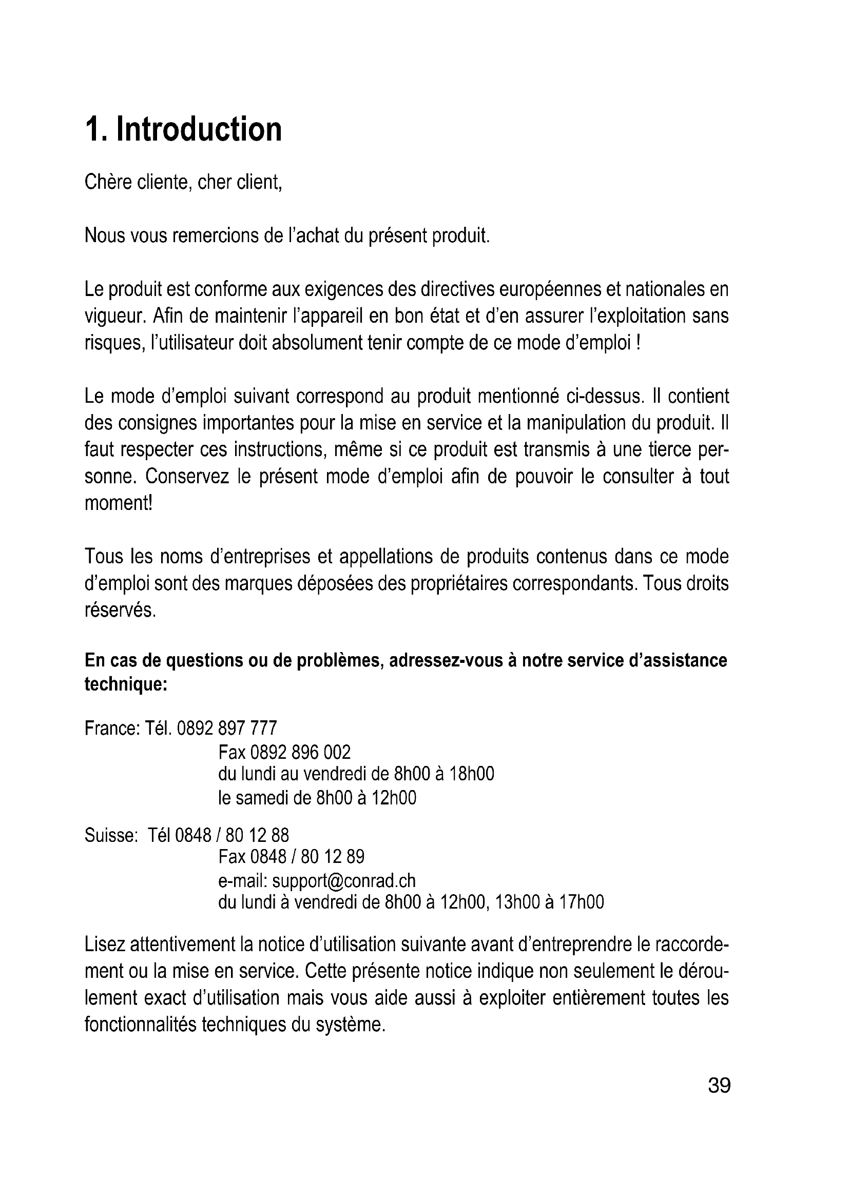 Chère cliente, cher client, Nous vous remercions de l’achat du présent produit. Le produit est conforme aux exigences des directives européennes et nationales en vigueur. Afin de maintenir l’appareil en bon état et d’en assurer l’exploitation sans risques, l’utilisateur doit absolument tenir compte de ce mode d’emploi ! Le mode d’emploi suivant correspond au produit mentionné ci-dessus. Il contient des consignes importantes pour la mise en service et la manipulation du produit. Il faut respecter ces instructions, même si ce produit est transmis à une tierce per- sonne. Conservez le présent mode d’emploi afin de pouvoir le consulter à tout moment! Tous les noms d’entreprises et appellations de produits contenus dans ce mode d’emploi sont des marques déposées des propriétaires correspondants. Tous droits réservés. En cas de questions ou de problèmes, adressez-vous à notre service d’assistance technique: France: Tél. 0892 897 777 Fax 0892 896 002 du lundi au vendredi de 8h00 à 18h00 le samedi de 8h00 à 12h00 Suisse: Tél 0848 / 80 12 88 Fax 0848 / 80 12 89 e-mail: support@conrad.ch du lundi à vendredi de 8h00 à 12h00, 13h00 à 17h00 Lisez attentivement la notice d’utilisation suivante avant d’entreprendre le raccorde- ment ou la mise en service. Cette présente notice indique non seulement le dérou- lement exact d’utilisation mais vous aide aussi à exploiter entièrement toutes les fonctionnalités techniques du système.