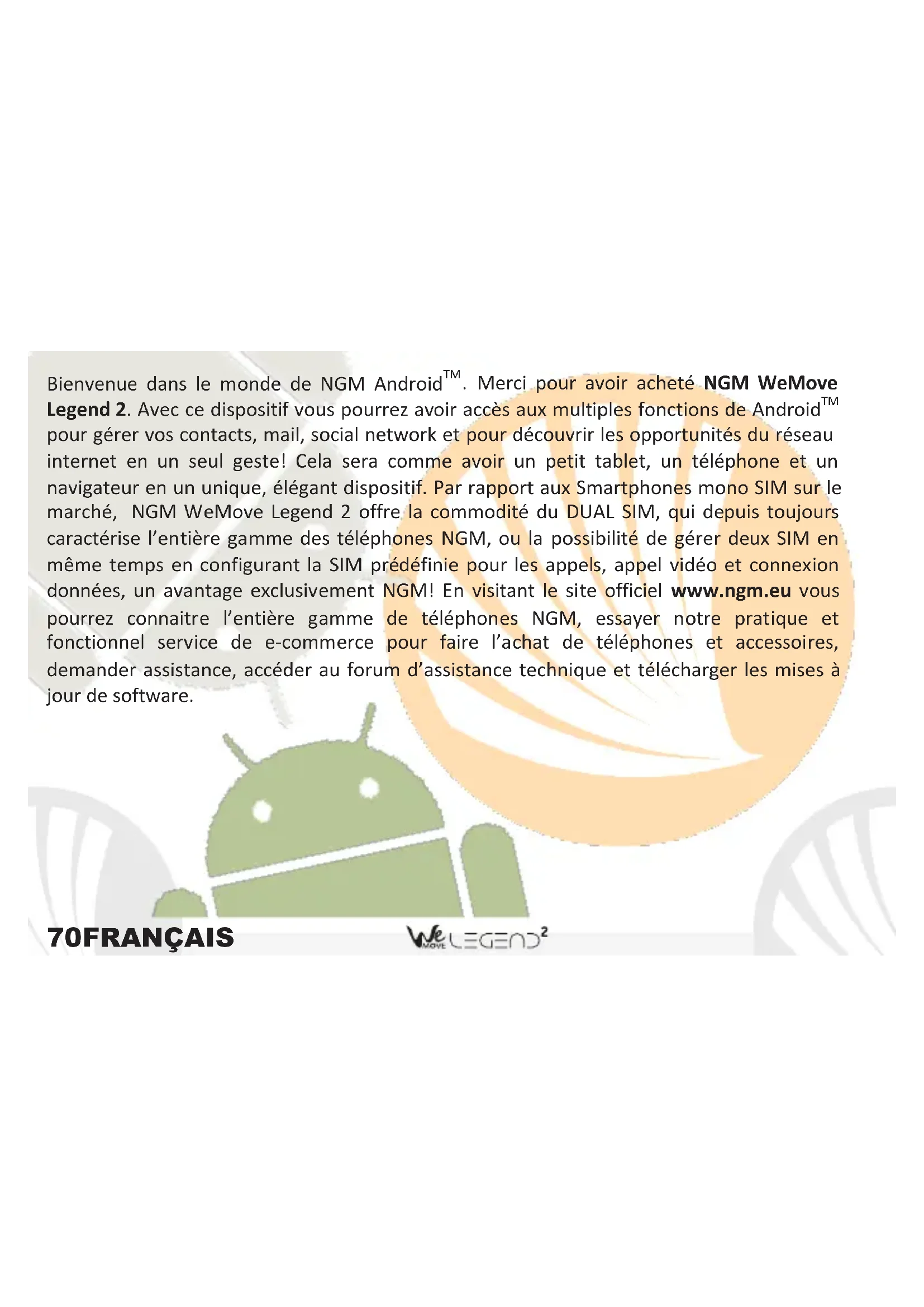 . Merci pour avoir acheté NGM WeMove Legend 2. Avec ce dispositif vous pourrez avoir accès aux multiples fonctions de Android
