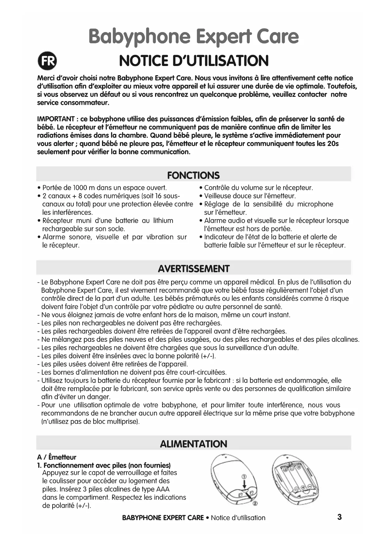 AVERTISSEMENT - Le Babyphone Expert Care ne doit pas être perçu comme un appareil médical. En plus de l’utilisation duBabyphone Expert Care, il est vivement recommandé que votre bébé fasse régulièrement l’objet d’uncontrôle direct de la part d’un adulte. Les bébés prématurés ou les enfants considérés comme à risquedoivent faire l’objet d’un contrôle par votre pédiatre ou autre personnel de santé.- Ne vous éloignez jamais de votre enfant hors de la maison, même un court instant.- Les piles non rechargeables ne doivent pas être rechargées.- Les piles rechargeables doivent être retirées de l’appareil avant d’être rechargées.- Ne mélangez pas des piles neuves et des piles usagées, ou des piles rechargeables et des piles alcalines.- Les piles rechargeables ne doivent être chargées que sous la surveillance d’un adulte.- Les piles doivent être insérées avec la bonne polarité (+/-).- Les piles usées doivent être retirées de l’appareil.- Les bornes d’alimentation ne doivent pas être court-circuitées.- Utilisez toujours la batterie du récepteur fournie par le fabricant : si la batterie est endommagée, elledoit être remplacée par le fabricant, son service après vente ou des personnes de qualification similaireafin d’éviter un danger.- Pour une utilisation optimale de votre babyphone, et pour limiter toute interférence, nous vousrecommandons de ne brancher aucun autre appareil électrique sur la même prise que votre babyphone(n’utilisez pas de bloc multiprise). ALIMENTATION A / Émetteur1. Fonctionnement avec piles (non fournies)Appuyez sur le capot de verrouillage et faitesle coulisser pour accéder au logement despiles. Insérez 3 piles alcalines de type AAAdans le compartiment. Respectez les indicationsde polarité (+/-). Babyphone Expert Care
