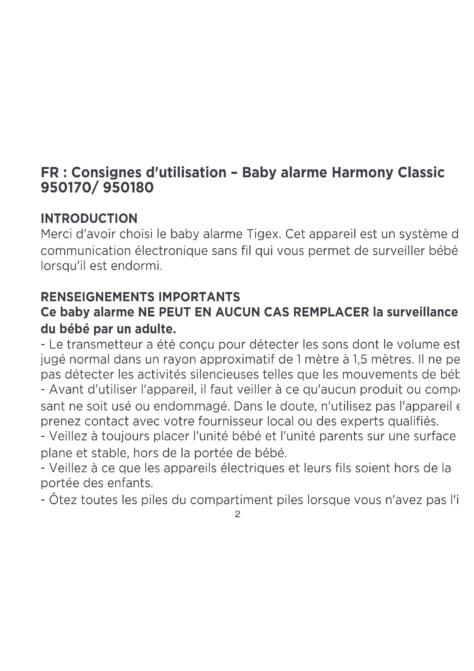 950170 / 950180 Notice d’utilisation Operating instructions Instrucciones de uso Instruções de uso Istruzioni per l’uzo Gebruiksaanwijzing Gebrauchsanleitung Инструкция по эксплуатации Upute za upotrebu Baby alarme Harmony Classic Baby alarm Harmony Classic Alarma de bebé Harmony Classic Intercomunicador Harmony Classic Interfono per neonati Harmony Classic Harmony Classic babyfoon Babyalarm Harmony Classic Радио-няня Harmony Classic Alarm za nadzor beba Harmony Classic Harmony Classic2 FR : Consignes d'utilisation – Baby alarme Harmony Classic 950170/ 950180 INTRODUCTION Merci d'avoir choisi le baby alarme Tigex. Cet appareil est un système de communication électronique sans fil qui vous permet de surveiller bébé lorsqu'il est endormi. RENSEIGNEMENTS IMPORTANTS Ce baby alarme NE PEUT EN AUCUN CAS REMPLACER la surveillance du bébé par un adulte. - Le transmetteur a été conçu pour détecter les sons dont le volume est jugé normal dans un rayon approximatif de 1 mètre à 1,5 mètres. Il ne peut pas détecter les activités silencieuses telles que les mouvements de bébé. - Avant d'utiliser l'appareil, il faut veiller à ce qu'aucun produit ou compo- sant ne soit usé ou endommagé. Dans le doute, n'utilisez pas l'appareil et prenez contact avec votre fournisseur local ou des experts qualifiés. - Veillez à toujours placer l'unité bébé et l'unité parents sur une surface plane et stable, hors de la portée de bébé. - Veillez à ce que les appareils électriques et leurs fils soient hors de la portée des enfants. - Ôtez toutes les piles du compartiment piles lorsque vous n'avez pas l'in-3 tention d'utiliser l'unité durant une longue période. - Afin de maximiser la portée, nous vous recommandons de brancher le transmetteur au circuit d'alimentation. La portée du transmetteur est moindre (moins de 300 mètres s'il n'y a pas d'obstacles) lorsqu'il fonc- tionne sur piles. - Lorsque la distance entre le récepteur et le transmetteur est trop courte, cela peut générer des effets Larsen (son très strident). Afin de les éviter, il faut simplement augmenter la distance entre le récepteur et le trans- metteur ou baisser le volume du récepteur. - Si la distance entre le récepteur et le transmetteur est trop grande, cela peut générer des interférences. Cela signifie que vous avez atteint la por- tée maximale de votre appareil. Pour résoudre ce problème, il suffit de ré- duire la distance entre le récepteur et le transmetteur. - La portée maximale est d'approximativement 300 mètres sur un terrain sans obstacles. La portée de l'appareil varie en fonction des obstacles qu'il rencontre (le terrain, le nombre de cloisons entre le transmetteur et le ré- cepteur, la présence de structures en métal, le niveau de chargement des piles, etc.). - N'utilisez jamais ce produit près de lumières néon ou autres dispositifs électriques/électroniques comme des télévisions, moteurs, PC, téléphones sans fils DECT, etc. Cela pourrait altérer le fonctionnement du produit. - Il est essentiel de vérifier le bon fonctionnement des unités bébé et pa-4 rents ; veillez plus particulièrement à ce que la réception du signal soit claire et que la distance prévue ait été respectée. - Ce système ne doit pas servir à espionner des conversations privées. Ce type d'utilisation est strictement illégal. - Veuillez lire attentivement toutes les consignes avant d'utiliser ce baby alarme. Veuillez garder le présent document car il sert de preuve d'achat et pourra également être utilisé à des fins d'identification lors d'un éven- tuel vol. - N'essayez jamais de démonter vous-même votre baby alarme. - Veillez à ce que les appareils restent à l'abri de la chaleur (maximum 40 °C) et de l'humidité. - Nettoyez l'appareil à l'aide d'un chiffon doux et sec. Ne l'immergez pas dans l'eau et veillez à ce qu'il ne reçoive pas de gouttes d'eau ou d'écla- boussures. - Les adaptateurs peuvent s'échauffer lorsque l'appareil est en fonction- nement ; lorsque vous les utiliser, veillez à ce que la chaleur puisse se dis- perser et ne les recouvrez pas. - Veillez à ne pas laisser tomber l'appareil et à lui éviter tout impact violent. - N'utilisez ce produit qu'avec les connexions électriques incluses ou four- nies en tant qu'accessoire. - Ne placez pas de flammes, comme des bougies allumées, sur l'appareil. - Veuillez respecter l'environnement : ne jetez pas les piles usagées à la5 poubelle, remettez-les dans les points de collecte mis à votre disposition. - N.B. afin d'éviter tout risque d'électrocution ; n'exposez pas l'appareil à la pluie ou à l'humidité. - Les piles doivent rester à l'abri de toute chaleur excessive (soleil, feu, etc.) - Le bloc d’alimentation sert de dispositif de sectionnement et doit être ai- sément accessible. - Veillez à toujours débrancher les adaptateurs du circuit d'alimentation des prises électriques lorsque l'appareil n'est pas en fonctionnement. - Le commutateur de l'alimentation électrique doit être facilement accessible.