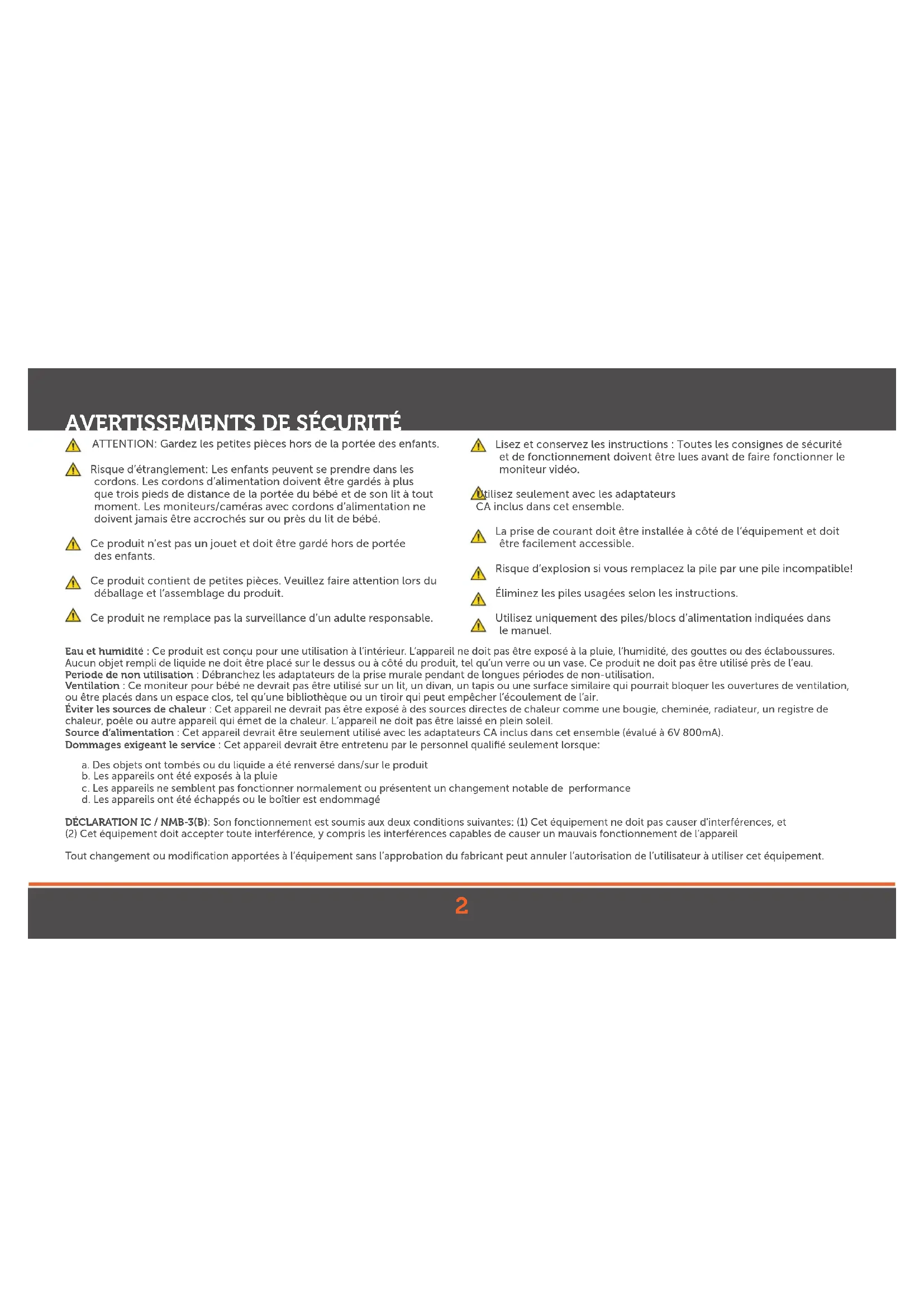 ATTENTION: Gardez les petites pièces hors de la portée des enfants. Risque d’étranglement: Les enfants peuvent se prendre dans les cordons. Les cordons d’alimentation doivent être gardés à plus que trois pieds de distance de la portée du bébé et de son lit à tout moment. Les moniteurs/caméras avec cordons d’alimentation ne doivent jamais être accrochés sur ou près du lit de bébé. Ce produit n’est pas un jouet et doit être gardé hors de portée des enfants. Ce produit contient de petites pièces. Veuillez faire attention lors du déballage et l’assemblage du produit. Ce produit ne remplace pas la surveillance d’un adulte responsable. Lisez et conservez les instructions : Toutes les consignes de sécurité et de fonctionnement doivent être lues avant de faire fonctionner le moniteur vidéo. Utilisez seulement avec les adaptateurs CA inclus dans cet ensemble. La prise de courant doit être installée à côté de l’équipement et doit être facilement accessible. Risque d’explosion si vous remplacez la pile par une pile incompatible! Éliminez les piles usagées selon les instructions. Utilisez uniquement des piles/blocs d’alimentation indiquées dans le manuel. Eau et humidité : Ce produit est conçu pour une utilisation à l’intérieur. L’appareil ne doit pas être exposé à la pluie, l’humidité, des gouttes ou des éclaboussures. Aucun objet rempli de liquide ne doit être placé sur le dessus ou à côté du produit, tel qu’un verre ou un vase. Ce produit ne doit pas être utilisé près de l’eau. Periode de non utilisation : Débranchez les adaptateurs de la prise murale pendant de longues périodes de non-utilisation. Ventilation : Ce moniteur pour bébé ne devrait pas être utilisé sur un lit, un divan, un tapis ou une surface similaire qui pourrait bloquer les ouvertures de ventilation, ou être placés dans un espace clos, tel qu’une bibliothèque ou un tiroir qui peut empêcher l’écoulement de l’air. Éviter les sources de chaleur : Cet appareil ne devrait pas être exposé à des sources directes de chaleur comme une bougie, cheminée, radiateur, un registre de chaleur, poêle ou autre appareil qui émet de la chaleur. L’appareil ne doit pas être laissé en plein soleil. Source d’alimentation : Cet appareil devrait être seulement utilisé avec les adaptateurs CA inclus dans cet ensemble (évalué à 6V 800mA). Dommages exigeant le service : Cet appareil devrait être entretenu par le personnel qualifié seulement lorsque: a. Des objets ont tombés ou du liquide a été renversé dans/sur le produit b. Les appareils ont été exposés à la pluie c. Les appareils ne semblent pas fonctionner normalement ou présentent un changement notable de performance d. Les appareils ont été échappés ou le boîtier est endommagé DÉCLARATION IC / NMB-3(B): Son fonctionnement est soumis aux deux conditions suivantes: (1) Cet équipement ne doit pas causer d’interférences, et (2) Cet équipement doit accepter toute interférence, y compris les interférences capables de causer un mauvais fonctionnement de l’appareil Tout changement ou modification apportées à l’équipement sans l’approbation du fabricant peut annuler l’autorisation de l’utilisateur à utiliser cet équipement.3