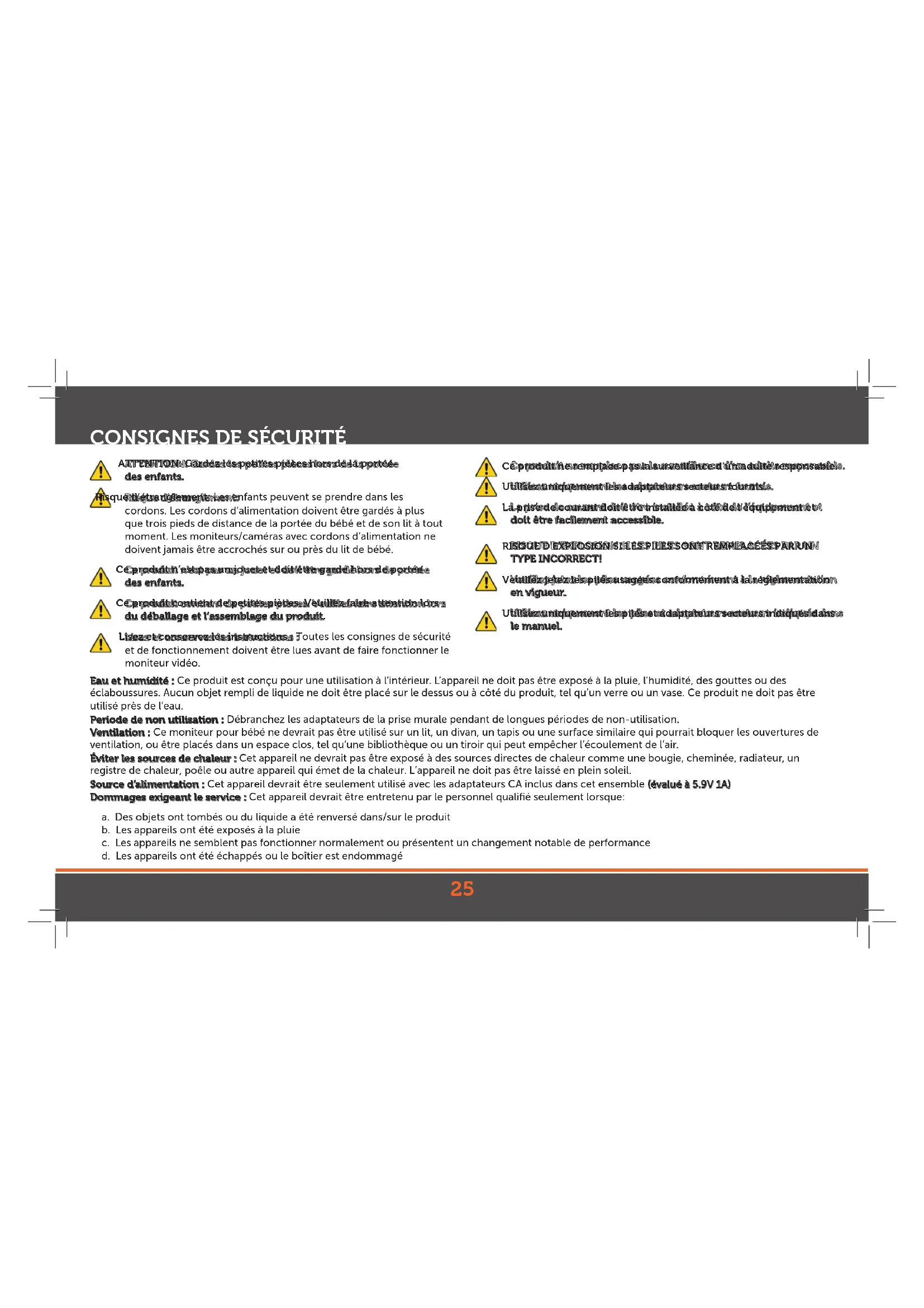ATTENTION: Gardez les petites pièces hors de la portée des enfants. Risque d’étranglement: Les enfants peuvent se prendre dans les cordons. Les cordons d’alimentation doivent être gardés à plus que trois pieds de distance de la portée du bébé et de son lit à tout moment. Les moniteurs/caméras avec cordons d’alimentation ne doivent jamais être accrochés sur ou près du lit de bébé. Ce produit n’est pas un jouet et doit être gardé hors de portée des enfants. Ce produit contient de petites pièces. Veuillez faire attention lors du déballage et l’assemblage du produit. Lisez et conservez les instructions : Toutes les consignes de sécurité et de fonctionnement doivent être lues avant de faire fonctionner le moniteur vidéo. Ce produit ne remplace pas la surveillance d’un adulte responsable. Utilisez uniquement les adaptateurs secteurs fournis. La prise de courant doit être installée à côté de l’équipement et doit être facilement accessible. RISQUE D’EXPLOSION SI LES PILES SONT REMPLACÉES PAR UN TYPE INCORRECT! Veuillez jetez les piles usagées conformément à la réglementation en vigueur. Utilisez uniquement les piles et adaptateurs secteurs indiqués dans le manuel. Eau et humidité : Ce produit est conçu pour une utilisation à l’intérieur. L’appareil ne doit pas être exposé à la pluie, l’humidité, des gouttes ou des éclaboussures. Aucun objet rempli de liquide ne doit être placé sur le dessus ou à côté du produit, tel qu’un verre ou un vase. Ce produit ne doit pas être utilisé près de l’eau. Periode de non utilisation : Débranchez les adaptateurs de la prise murale pendant de longues périodes de non-utilisation. Ventilation : Ce moniteur pour bébé ne devrait pas être utilisé sur un lit, un divan, un tapis ou une surface similaire qui pourrait bloquer les ouvertures de ventilation, ou être placés dans un espace clos, tel qu’une bibliothèque ou un tiroir qui peut empêcher l’écoulement de l’air. Éviter les sources de chaleur : Cet appareil ne devrait pas être exposé à des sources directes de chaleur comme une bougie, cheminée, radiateur, un registre de chaleur, poêle ou autre appareil qui émet de la chaleur. L’appareil ne doit pas être laissé en plein soleil. Source d’alimentation : Cet appareil devrait être seulement utilisé avec les adaptateurs CA inclus dans cet ensemble (évalué à 5.9V 1A) Dommages exigeant le service : Cet appareil devrait être entretenu par le personnel qualifié seulement lorsque: a. Des objets ont tombés ou du liquide a été renversé dans/sur le produit b. Les appareils ont été exposés à la pluie c. Les appareils ne semblent pas fonctionner normalement ou présentent un changement notable de performance d. Les appareils ont été échappés ou le boîtier est endommagé26 Cet appareil est conforme à la partie 15 des règlements de la FCC. Son fonctionnement est soumis aux deux conditions suivantes: (1) Cet équipement ne doit pas causer d’interférences nuisibles et (2) Cet équipement doit accepter toute interférence reçue, y compris les interférences capables de causer un mauvais fonctionnement.