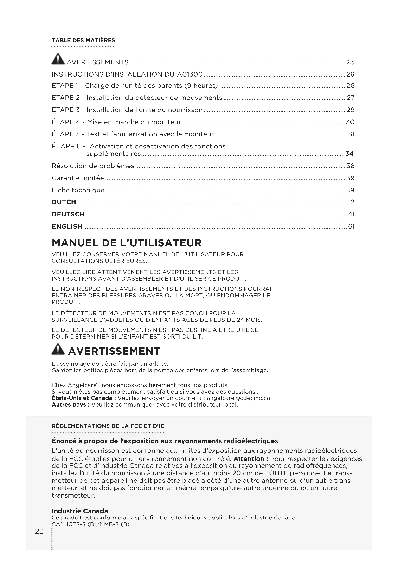 , nous endossons fièrement tous nos produits. Si vous n’êtes pas complètement satisfait ou si vous avez des questions : États-Unis et Canada : Veuillez envoyer un courriel à : angelcare@cdecinc.ca Autres pays : Veuillez communiquer avec votre distributeur local. RÉGLEMENTATIONS DE LA FCC ET D’IC Énoncé à propos de l’exposition aux rayonnements radioélectriques L’unité du nourrisson est conforme aux limites d’exposition aux rayonnements radioélectriques de la FCC établies pour un environnement non contrôlé. Attention : Pour respecter les exigences de la FCC et d’Industrie Canada relatives à l’exposition au rayonnement de radiofréquences, installez l’unité du nourrisson à une distance d’au moins 20 cm de TOUTE personne. Le trans- metteur de cet appareil ne doit pas être placé à côté d’une autre antenne ou d’un autre trans- metteur, et ne doit pas fonctionner en même temps qu’une autre antenne ou qu’un autre transmetteur. Industrie Canada Ce produit est conforme aux spécifications techniques applicables d’Industrie Canada. CAN ICES-3 (B)/NMB-3 (B)