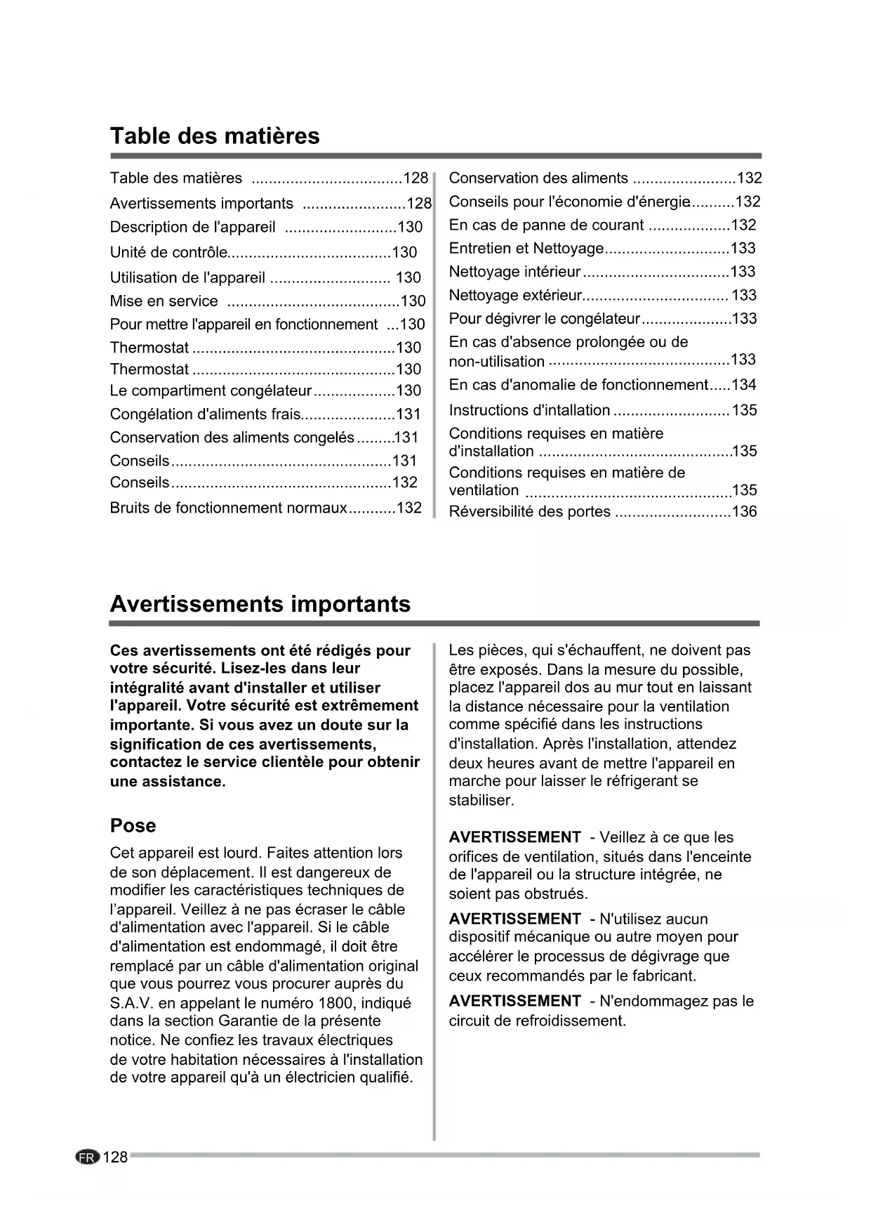 - Ces avertissements ont été rédigés pour votre sécurité. Lisez-les dans leur intégralité avant d'installer et utiliser l'appareil. Votre sécurité est extrêmement importante. Si vous avez un doute sur la signification de ces avertissements, contactez le service clientèle pour obtenir une assistance. Pose Cet appareil est lourd. Faites attention lors de son déplacement. Il est dangereux de modifier les caractéristiques techniques de l’appareil. Veillez à ne pas écraser le câble d'alimentation avec l'appareil. Si le câble d'alimentation est endommagé, il doit être remplacé par un câble d'alimentation original que vous pourrez vous procurer auprès du S.A.V. en appelant le numéro 1800, indiqué dans la section Garantie de la présente notice. Ne confiez les travaux électriques de votre habitation nécessaires à l'installation de votre appareil qu'à un électricien qualifié. Les pièces, qui s'échauffent, ne doivent pas être exposés. Dans la mesure du possible, placez l'appareil dos au mur tout en laissant la distance nécessaire pour la ventilation comme spécifié dans les instructions d'installation. Après l'installation, attendez deux heures avant de mettre l'appareil en marche pour laisser le réfrigerant se stabiliser. AVERTISSEMENT - Veillez à ce que les orifices de ventilation, situés dans l'enceinte de l'appareil ou la structure intégrée, ne soient pas obstrués. AVERTISSEMENT - N'utilisez aucun dispositif mécanique ou autre moyen pour accélérer le processus de dégivrage que ceux recommandés par le fabricant. AVERTISSEMENT - N'endommagez pas le circuit de refroidissement. Avertissements importants Table des matières Avertissements importants p. 128