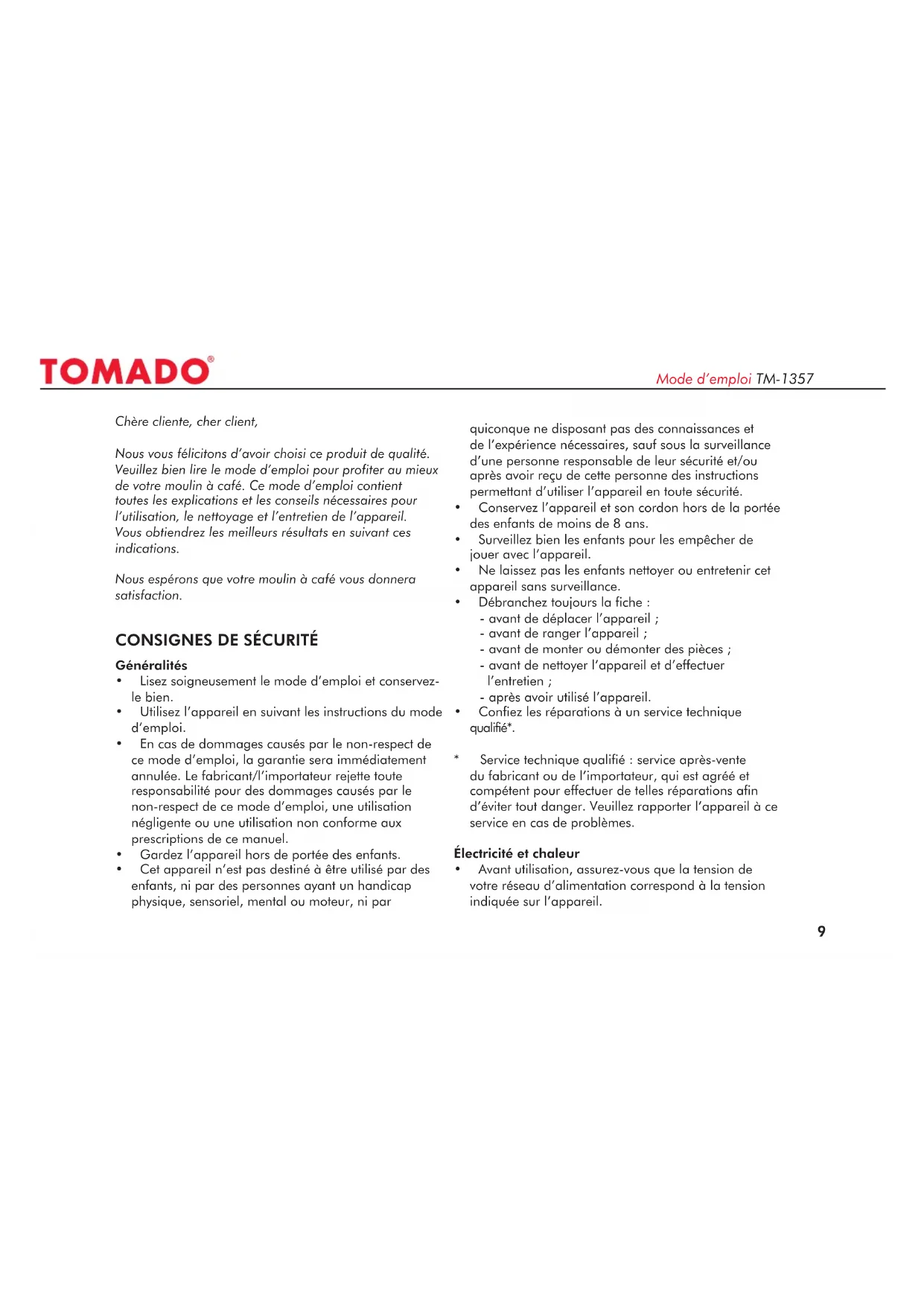 Retrouvez gratuitement la notice de l'appareil TM1357 Tomado au format PDF.