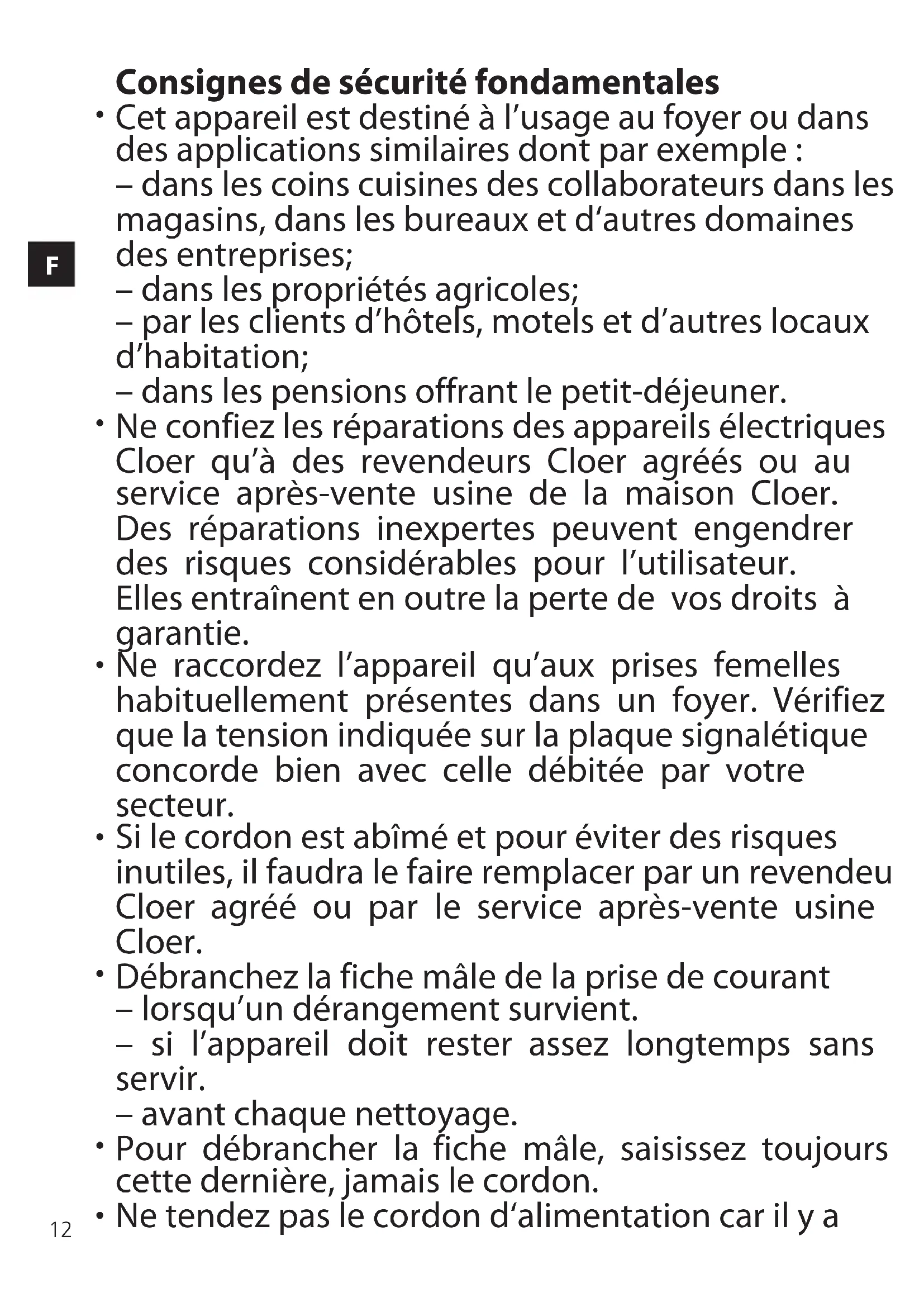 - Ne confiez les réparations des appareils électriques Cloer qu'à des revendeurs Cloer agréés ou au service après-vente usine de la maison Cloer. Des réparations inexpertes peuvent engendrer des risques considérables pour l'utilisateur. Elles entraînent en outre la perte de vos droits à garantie.