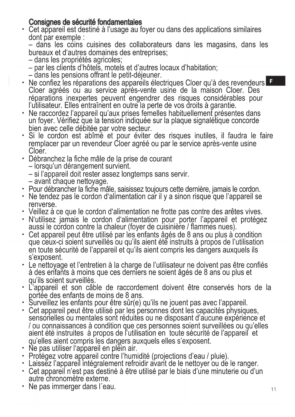 -dans les pensions offrant le petit-dejeuner. - Ne confiez les réparations des apparéils électriques Cloer qu'à des revendeurs Cloer agrées ou au service après-vente usine de la maison Cloer. Des réparations in expertes peuvent engendrer des risques considérables pour l'utilisateur. Elles entraînant en outre la perte de vos droits à garantie.