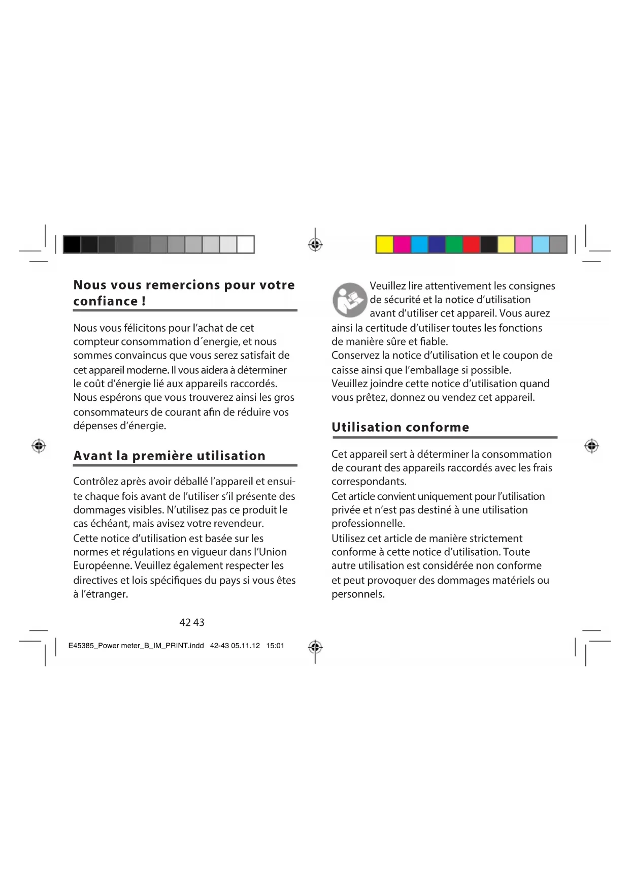 - Carte de garantie E45385_Power meter_B_IM_PRINT.indd 40-41 05.11.12 15:0142 43 Nous vous remercions pour votre confiance ! Nous vous félicitons pour l’achat de cet compteur consommation d´energie, et nous sommes convaincus que vous serez satisfait de cet appareil moderne. Il vous aidera à déterminer le coût d’énergie lié aux appareils raccordés. Nous espérons que vous trouverez ainsi les gros consommateurs de courant an de réduire vos dépenses d’énergie. Avant la première utilisation Contrôlez après avoir déballé l’appareil et ensui- te chaque fois avant de l’utiliser s’il présente des dommages visibles. N’utilisez pas ce produit le cas échéant, mais avisez votre revendeur. Cette notice d’utilisation est basée sur les normes et régulations en vigueur dans l’Union Européenne. Veuillez également respecter les directives et lois spéciques du pays si vous êtes à l’étranger. Veuillez lire attentivement les consignes de sécurité et la notice d’utilisation avant d’utiliser cet appareil. Vous aurez ainsi la certitude d’utiliser toutes les fonctions de manière sûre et able. Conservez la notice d’utilisation et le coupon de caisse ainsi que l’emballage si possible. Veuillez joindre cette notice d’utilisation quand vous prêtez, donnez ou vendez cet appareil. Utilisation conforme Cet appareil sert à déterminer la consommation de courant des appareils raccordés avec les frais correspondants. Cet article convient uniquement pour l’utilisation privée et n’est pas destiné à une utilisation professionnelle. Utilisez cet article de manière strictement conforme à cette notice d’utilisation. Toute autre utilisation est considérée non conforme et peut provoquer des dommages matériels ou personnels. E45385_Power meter_B_IM_PRINT.indd 42-43 05.11.12 15:0144 45 Le fabricant décline toute responsabilité pour les dégâts causés par une utilisation non con- forme. Consignes de sécurité Veuillez noter les points suivants avant de prendre en service votre compteur consommation d´energie : Une installation électrique défectueuse ou une tension du secteur trop élevée peut provoquer une décharge électrique. p. 118