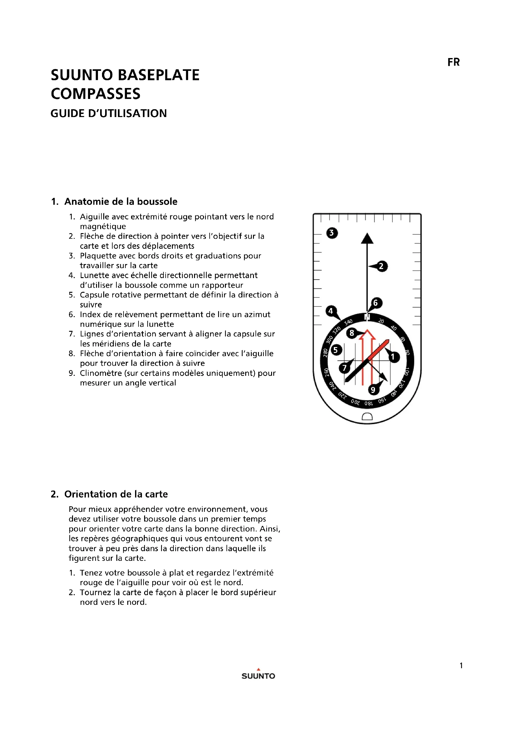 1. Aiguille avec extrémité rouge pointant vers le nord magnétique2. Flèche de direction à pointer vers l’objectif sur la carte et lors des déplacements3. Plaquette avec bords droits et graduations pour travailler sur la carte 4. Lunette avec échelle directionnelle permettant d’utiliser la boussole comme un rapporteur5. Capsule rotative permettant de définir la direction à suivre6. Index de relèvement permettant de lire un azimut numérique sur la lunette7. Lignes d’orientation servant à aligner la capsule sur les méridiens de la carte8. Flèche d’orientation à faire coïncider avec l’aiguille pour trouver la direction à suivre9. Clinomètre (sur certains modèles uniquement) pour mesurer un angle vertical