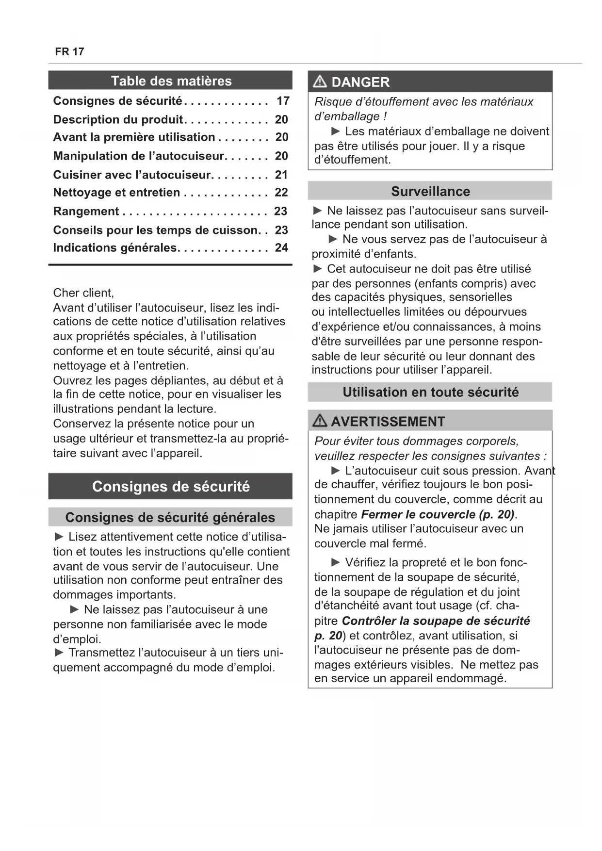 Avant d'utiliser l'autocuiseur, liquez les indications de cette notice d'utilisation relatives aux propriétés spéciales, à l'utilisation conforme et en toute sécurité, ainsi qu'au nettoyage et à l'entretien.