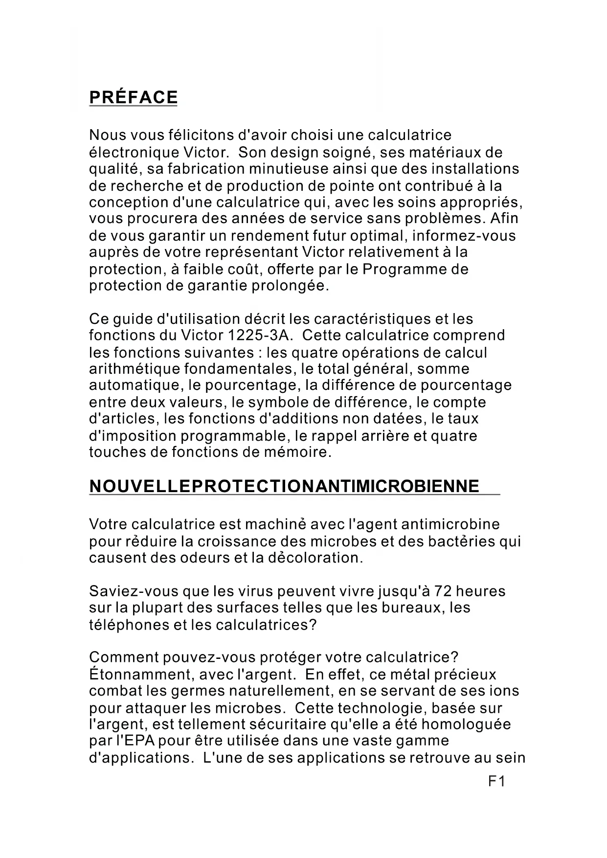 Nous vous félicitons d'avoir choisi une calculatrice électronique Victor. Son design soigné, ses matériaux de qualité, sa fabrication minutieuse ainsi que des installations de recherche et de production de pointe ont contribué à la conception d'une calculatrice qui, avec les soins appropriés, vous procurera des années de service sans problèmes. Afin de vous garantir un rendement Futures optimal, informez-vous auprès de votre représentant Victor relativement à la protection, à faible coût, offerte par le Programme de protection de garantie prolongée.