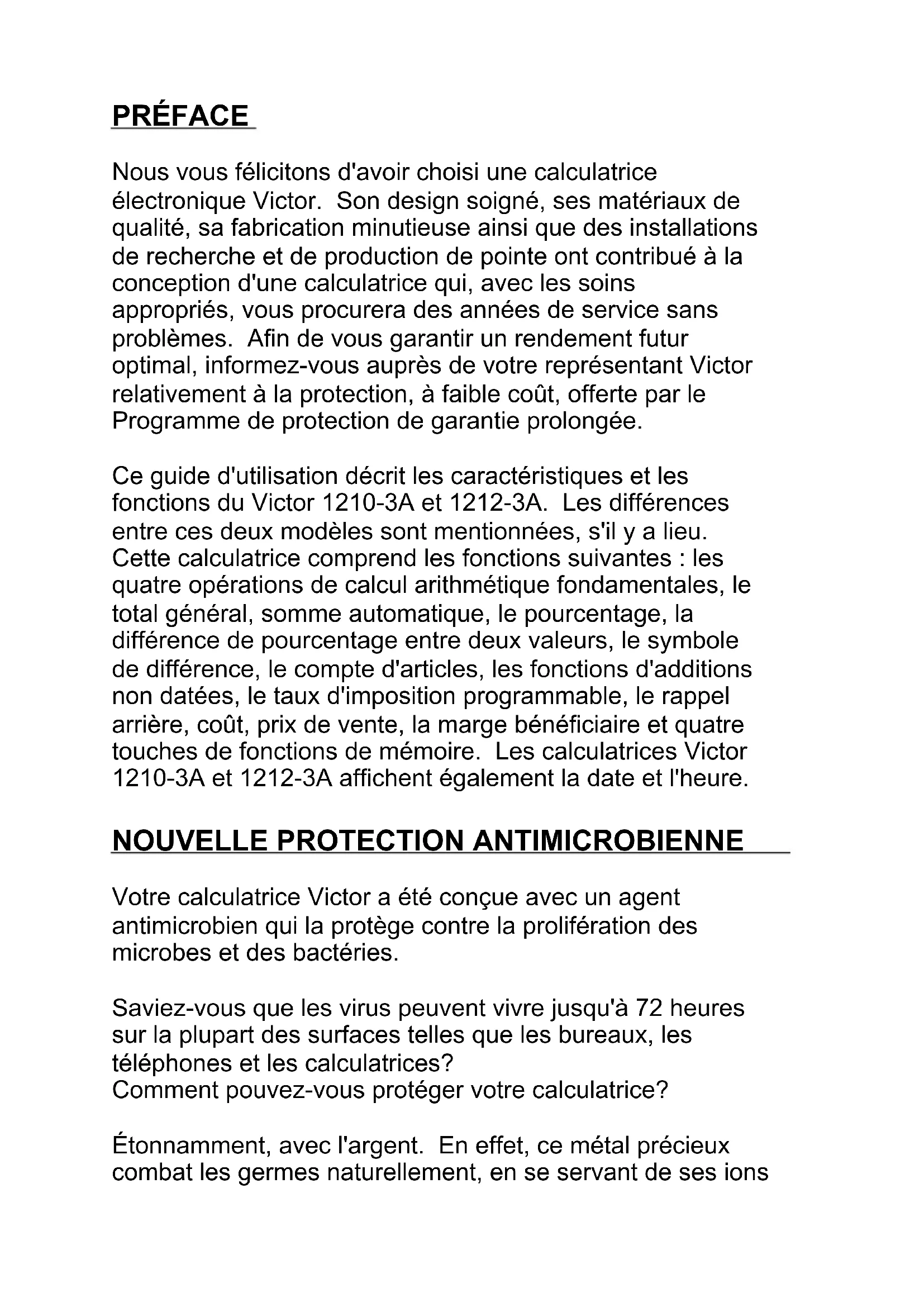 Nous vous félicitons d'avoir choisi une calculatrice électronique Victor. Son design soigné, ses matériaux de qualité, sa fabrication minutieuse ainsi que des installations de recherche et de production de pointe ont contribué à la conception d'une calculatrice qui, avec les soins appropriés, vous procurera des années de service sans problèmes. Afin de vous garantir un rendissement futuro optimal, informez-vous auprès de votre représentant Victor relativement à la protection, à faible coût, offerte par le Programme de protection de garantie prolongée.