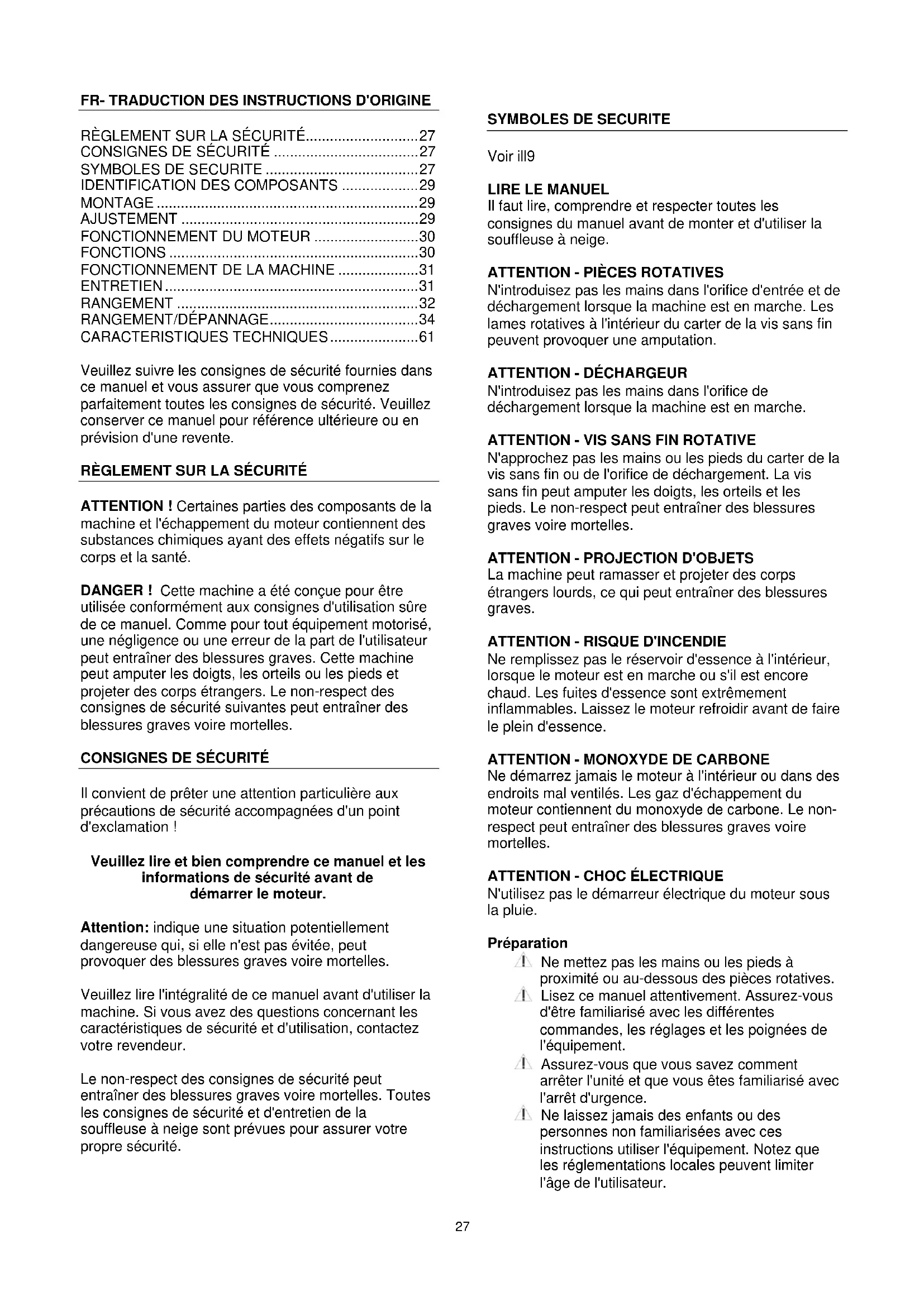 DANGER! Cette machine a ete conque pour etre utilise conformement aux consignes d'utilisation sure de ce manuel. comme pour tout equipement motorise, une négligence ou une erreur de la part de l'utilisateur peut entrainer des blessures graves. Cette machine peut amuter les doigs, les orteils ou les pieds et projeter des corps estrangers. Le non-respect des consignes de sécurité suivantes peut entrainer des blessures graves voire mortelles.
