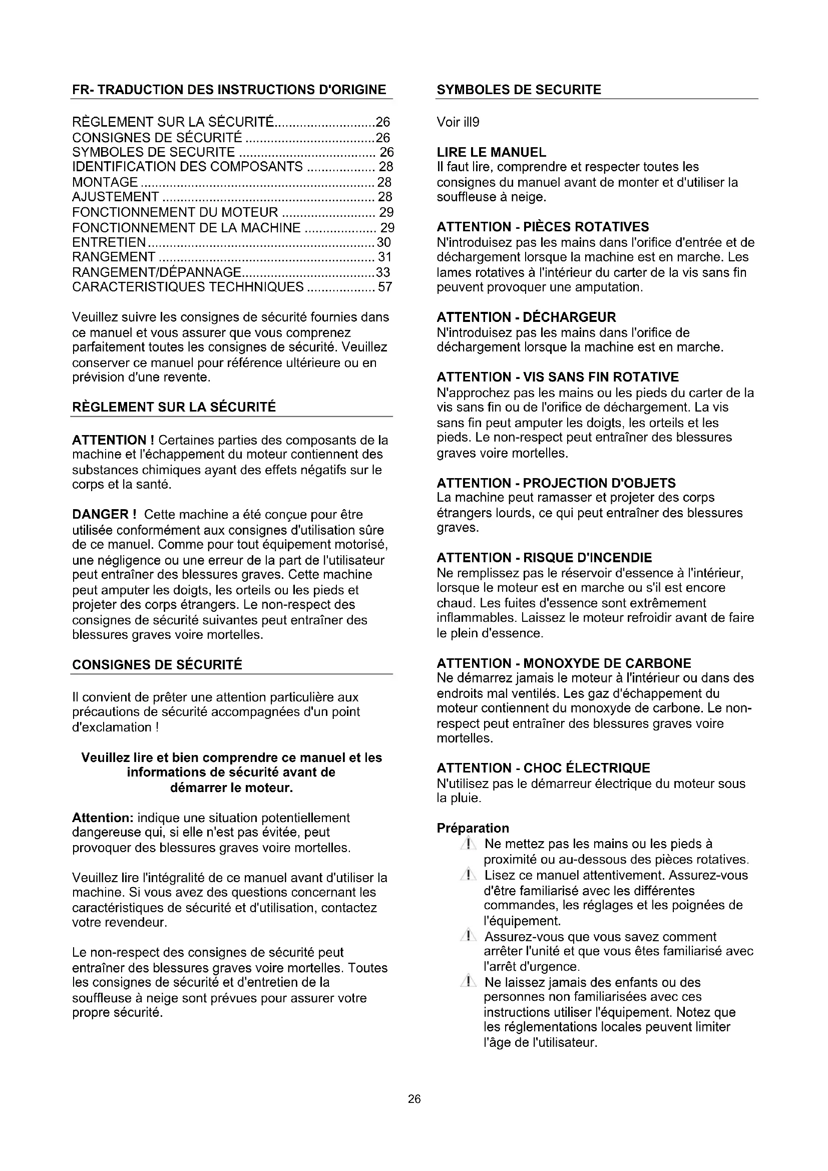 Le non-respect des consignes de sécurité peut entraîner des blessures graves voire mortelles. Toutes les consignes de sécurité et d'entretien de la souffleuse à neige sont prévues pour assurer votre propre sécurité.