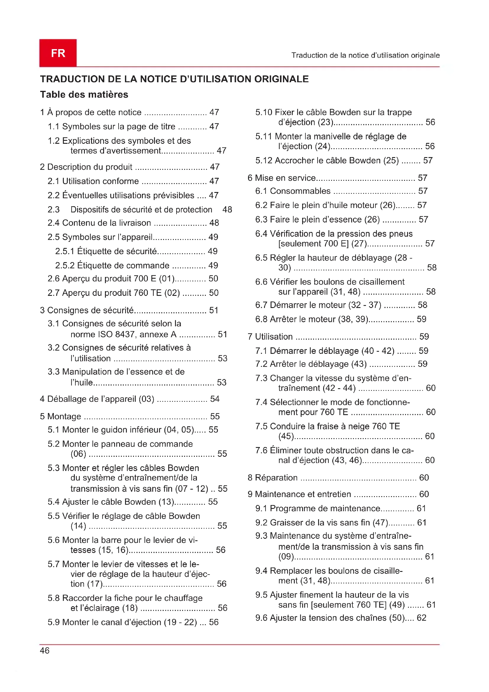 Traduction de la notice d’utilisation originale TRADUCTION DE LA NOTICE D’UTILISATION ORIGINALE Table des matières 1 À propos de cette notice .......................... 47