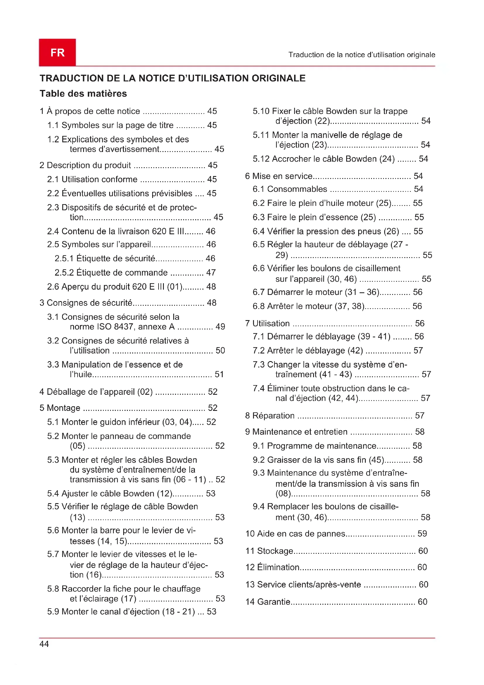 L’aperçu du produit (01) donne une vue d’en- semble de l’appareil. N° Pièce 1 Poignées chauffantes 2 Interrupteur d’éclairage 3 Interrupteur de chauffage des poignées 4 Boulons de cisaillement de rechange 5 Levier d’embrayage de la transmission à vis sans fin 6 Levier de commande de la hauteur d’éjection 7 Levier de vitesses, 6 vitesses en marche avant et 2 vitesses en marche arrière 8 Levier d’embrayage du système d’en- traînement 9 Déflecteur sur le canal d’éjection pour le réglage de la hauteur d’éjection 10 Canal d’éjection avec protection 11 Éclairage 12 Manivelle de réglage de la direction d’éjection 13 Bouchon du réservoir 14 Bouchon de remplissage d’huile 15 Bouclier 16 Outil de nettoyage (fixé sur le bouclier) 17 Cosse de bougie 18 Vis sans fin 19 Roue d’éjection 20 Plaque de déblayage 21 Patins réglables en hauteur