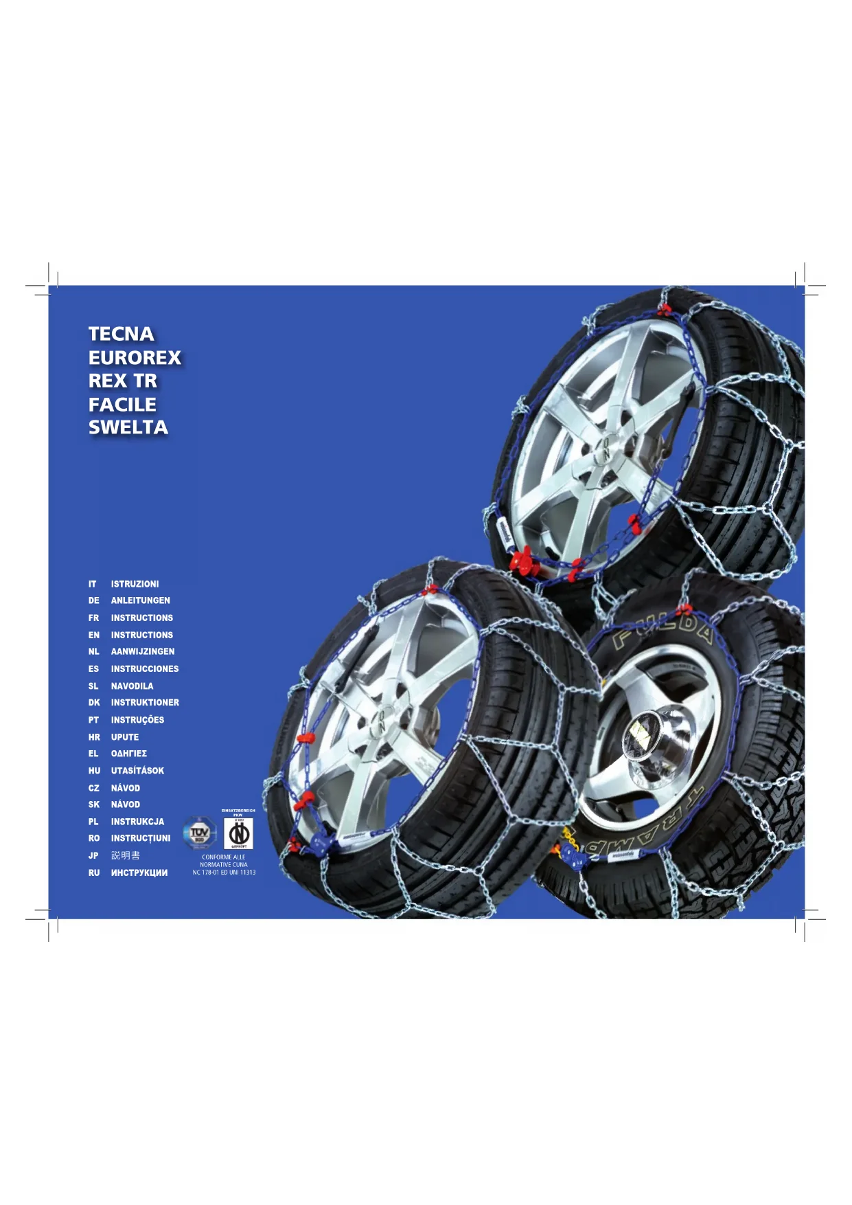 FR Cher client, ce dispositif antidérapant est un complément précieux de l'équipement hivernal de votre voiture. Nous vous félicitons de votre choix et nous vous rappelons que les chaînes neige sont un dispositif d'urgence et qu'il est donc nécessaire de respecter ces recommandations et ces instructions pour obtenir les performances attendues ainsi que pour éviter les éventuels problèmes dérivant de leur utilisation incorrecte.