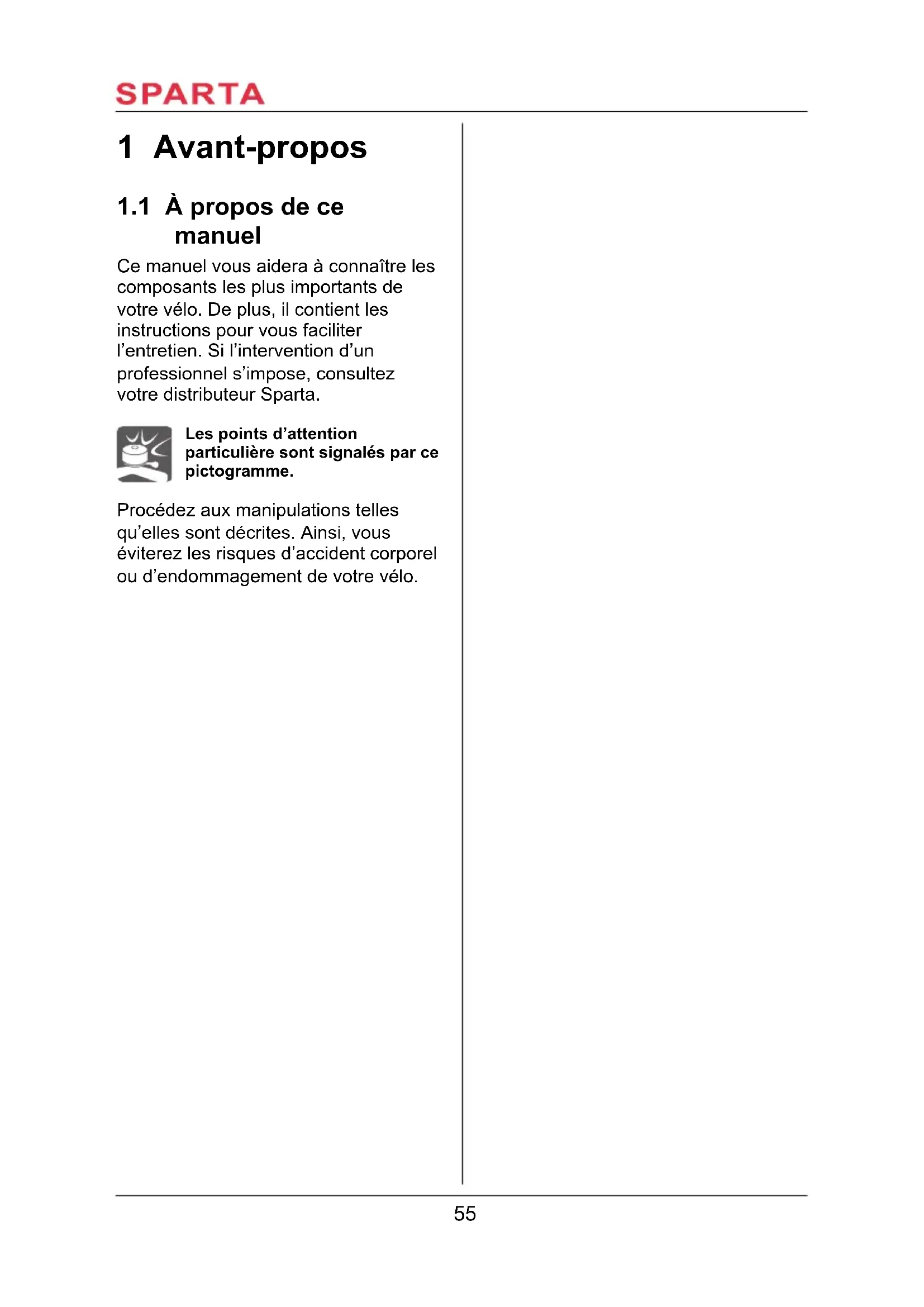 Ce manuel vous aidera à connaître les composants les plus importants de votre vélo. De plus, il contient les instructions pour vous faciliter l'entretien. Si l'intervention d'un professionnel s'impose, consultez votre distributeur Sparta.