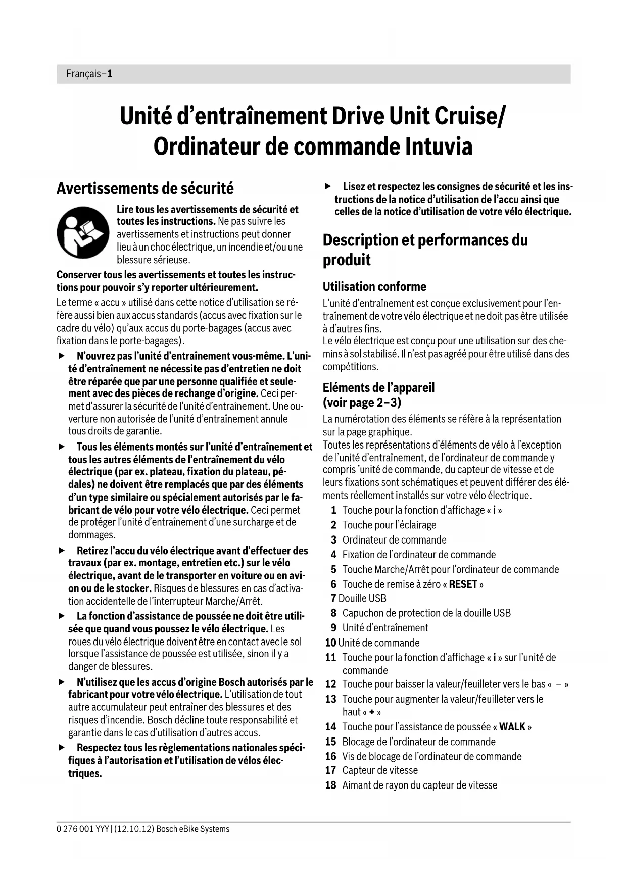 Lisez et respectez les consignes de sécurité et les instructions se trouvant dans les notices d'utilisation des accus et de l'unité d'entraînement/de l'ordinateur de commande ainsi que dans la notice d'utilisation de votre vélo électrique.