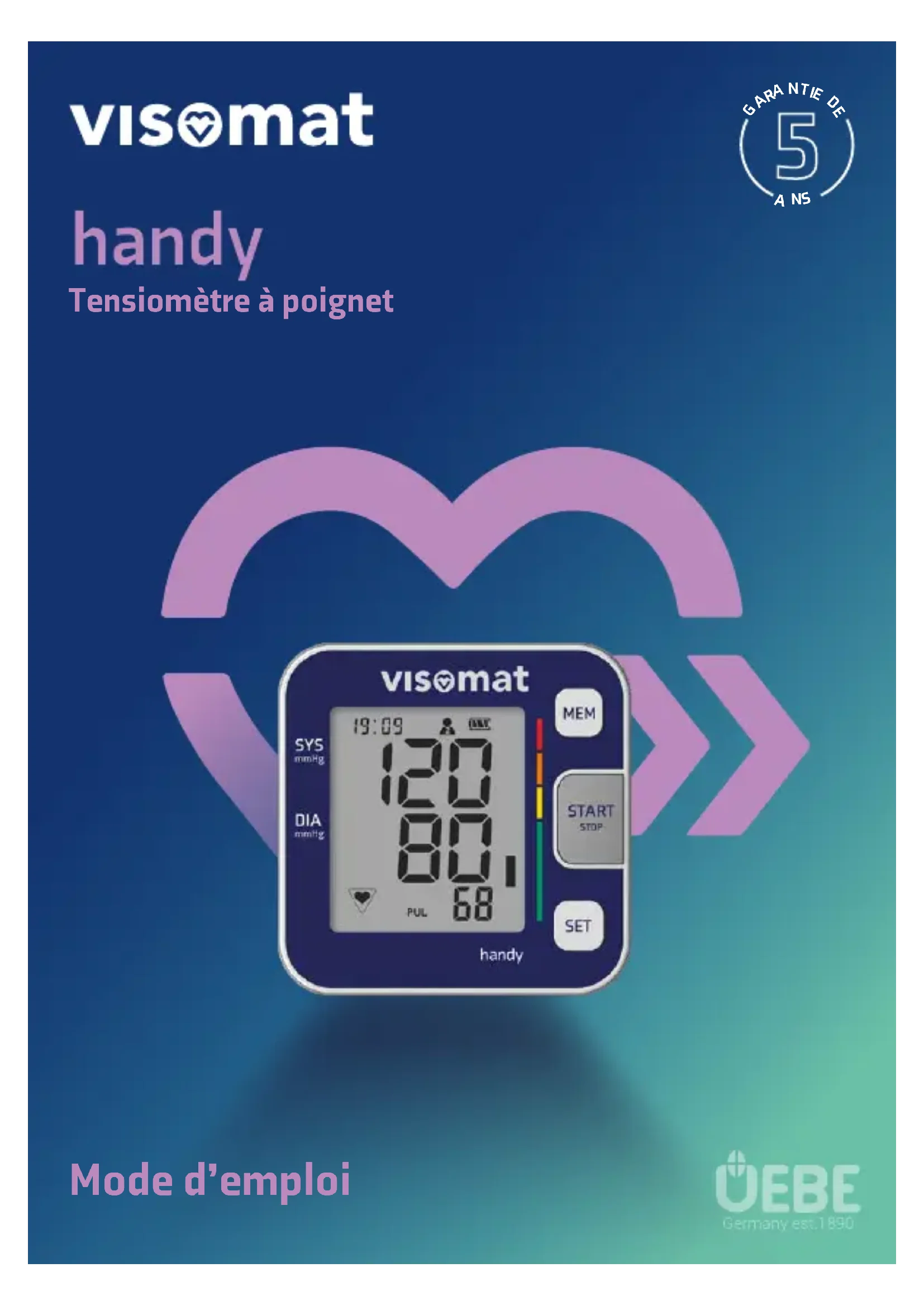 Seul le fabricant ou un service agréé est habilité à réparer l’appareil. Veuil- lez vous adresser à: UEBEMedicalGmbH Bgm.-Kuhn-Str. 22 97900Külsheim, Allemagne info@uebe.com, www.uebe.com Modèle: visomat handy Taille: 6,8 cm x 6,8 cm x 3,0 cm Poids : 103 g sans les piles Affichage : Affichage numérique LCD (cristaux liquides) Mémoire : 2mémoires avec 90valeurs mesurées chacune (stockage automatique) et indication des valeurs moyennes (AVG) Méthode de mesure : Méthode oscillométrique de la systole, la diastole et du pouls Gamme d’affichage : 0-299 mmHg Plage de mesure : Diastolique: 15-160mmHg Systolique: 40-240mmHg Mesure du pouls: 40-199pulsations/min Précision: Mesure de la tension artérielle (pression du bras- sard): ±3mmHg, fréquence du pouls: ±5% Alimentation électrique : 2piles 1,5V LR03, type AAA alcali-manganèse Conditions de fonctionne- ment : Température ambiante 5 à 40 °C. Humidité relative de l’air 15 à 93 %. Pression de l’air de 700 à 1060 hPa. Conditions de transport et de stockage : Température ambiante -25 à 70 °C. Humidité relative de l’air ≤ 93 %. Pression de l’air de 700 à 1060 hPa. Coupure automatique : 60 secondes Classe de protection IP: IP22: Protection contre les corps étrangers solides d’un diamètre supérieur ou égal à 12,5mm, protec- tion contre les projections d’eau. Protection contre les décharges électriques: Alimentation électrique interne, partie appliquée de type BF (brassard) Durée de vie prévue de l’appareil : 5 ans Mode de fonctionnement: Fonctionnement continu Classification : Alimentation électrique interne par pile