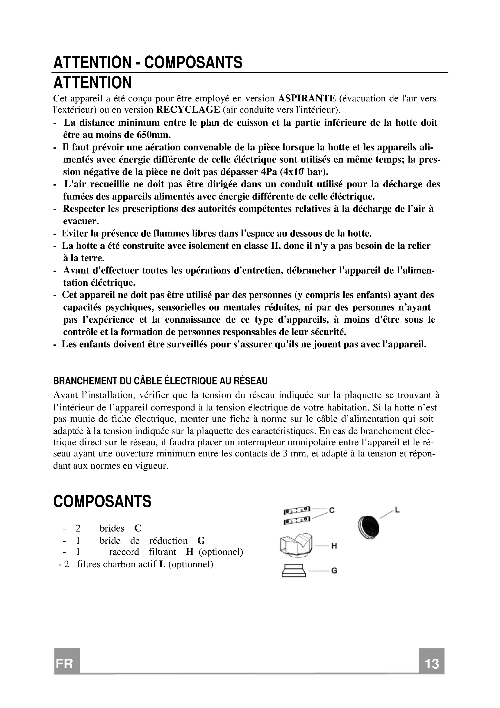 bar). - L'air recueillie ne doit pas être dirigée dans un conduit utilisé pour la décharge des fumées des appareils alimentés avec énergie différente de celle éléctrique. - Respecter les prescriptions des autorités compétentes relatives à la décharge de l'air à evacuer. - Eviter la présence de flammes libres dans l'espace au dessous de la hotte. - La hotte a été construite avec isolement en classe II, donc il n'y a pas besoin de la relier à la terre. - Avant d'effectuer toutes les opérations d'entretien, débrancher l'appareil de l'alimen- tation éléctrique. - Cet appareil ne doit pas être utilisé par des personnes (y compris les enfants) ayant des capacités psychiques, sensorielles ou mentales réduites, ni par des personnes n’ayant pas l’expérience et la connaissance de ce type d’appareils, à moins d'être sous le contrôle et la formation de personnes responsables de leur sécurité. - Les enfants doivent être surveillés pour s'assurer qu'ils ne jouent pas avec l'appareil. BRANCHEMENT DU CÂBLE ÉLECTRIQUE AU RÉSEAU Avant l’installation, vérifier que la tension du réseau indiquée sur la plaquette se trouvant à l’intérieur de l’appareil correspond à la tension électrique de votre habitation. Si la hotte n’est pas munie de fiche électrique, monter une fiche à norme sur le câble d’alimentation qui soit adaptée à la tension indiquée sur la plaquette des caractéristiques. En cas de branchement élec- trique direct sur le réseau, il faudra placer un interrupteur omnipolaire entre l’appareil et le ré- seau ayant une ouverture minimum entre les contacts de 3 mm, et adapté à la tension et répon- dant aux normes en vigueur. COMPOSANTS - 2 brides C - 1 bride de réduction G - 1 raccord filtrant H (optionnel) - 2 filtres charbon actif L (optionnel)FR