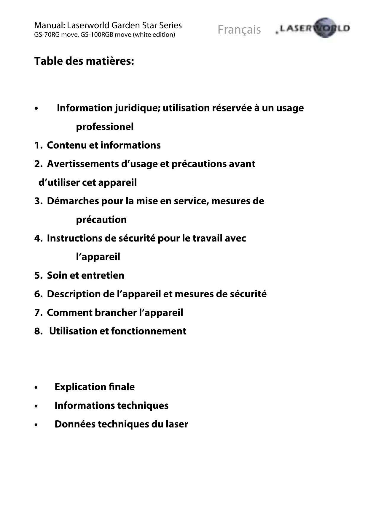 Pour les questions liées au service, demandez à votre marchand ou adressez-vous à Laserworld. Utilisez uniquement des pièces de rechange Laserworld. Nous nous réservons le droit d'effectuer des modifications, améliorations à ce mode d'emploi. Laserworld décline toute responsabilité en cas d'inexactitudes ou d'erreurs dans le présent mode d'emploi.