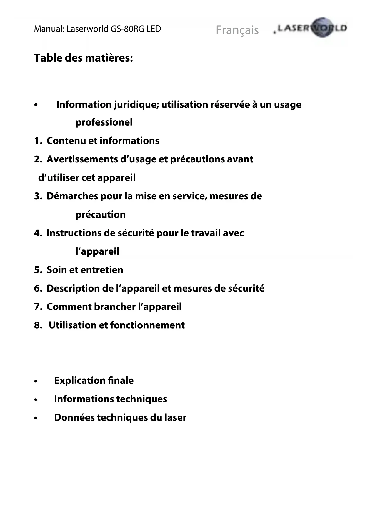 Retrouvez gratuitement la notice de l'appareil GS80RG LED Laserworld au format PDF.