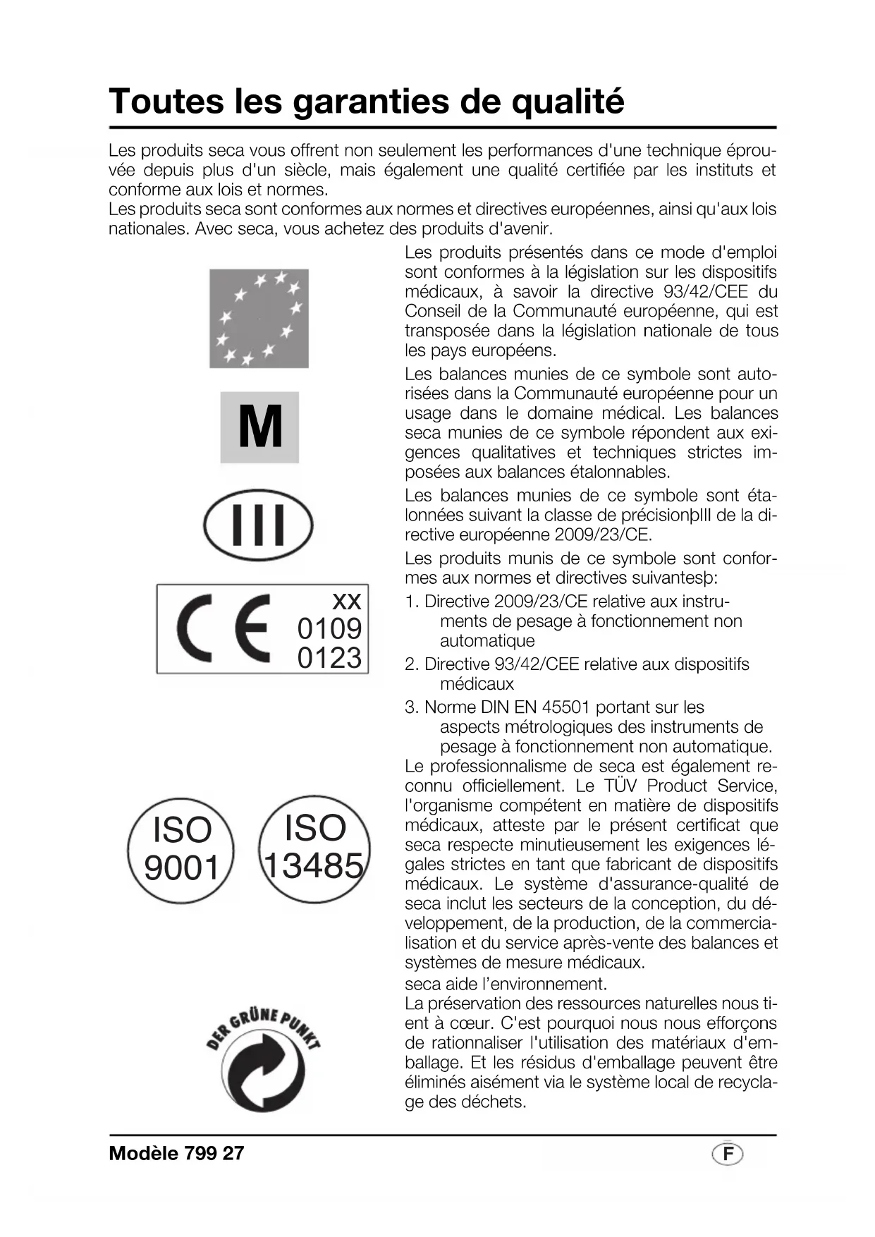 Les balances munies de ce symbole sont autorisées dans la Communauté européenne pour un usage dans le domaine médical. Les balances seca munies de ce symbole répondent aux exigences qualitatives et techniques strictes imposées aux balances étalonnables.