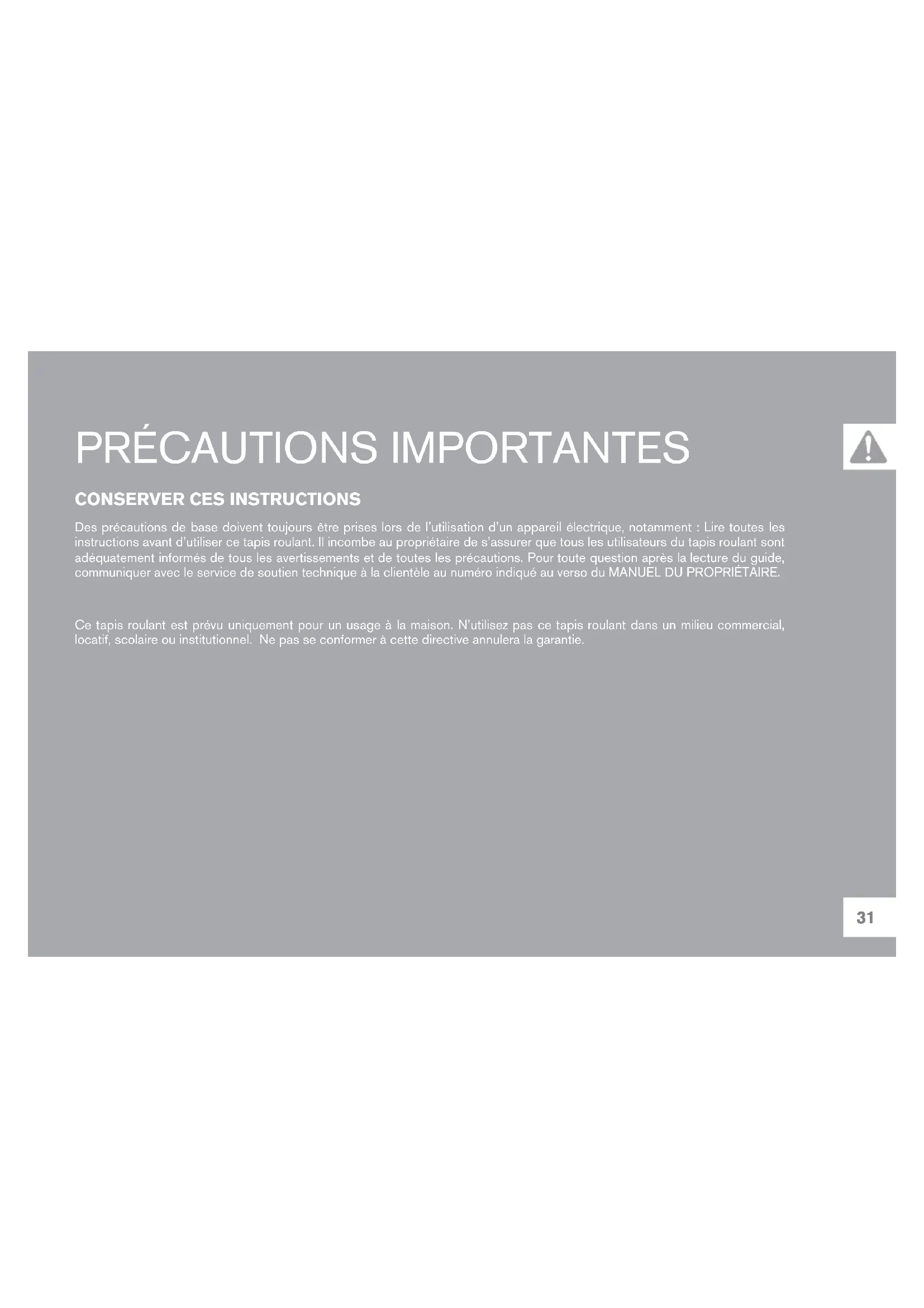 Des précautions de base doivent toujours être prises lors de l'utilisation d'un apparéel électrique, notamment : Lire toutes les instructions avant d'utiliser ce tapis roulant. Il incorme au propriétéaire de s'assurer que tous les utilisateurs du tapis roulant sont adequately informés de tous les avertissements et de toutes les précautions. Pour toute question après la lecture du guide, communiquer avec le service de soutien technique à la clientèle au numéro indiqué au verso du MANUEL DU PROPRIÉTAIRE.