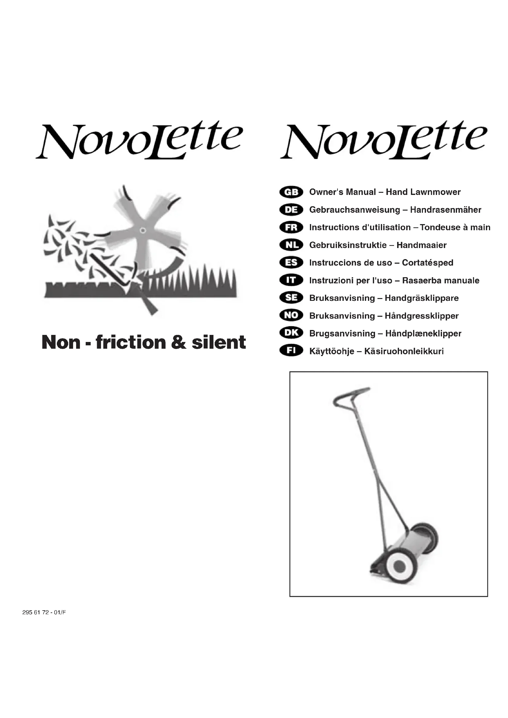 - A l'arrêt est mettre la machine hors de portée des enfants. (Ne pas oublier que le cylindre de coupe tourne facilement et que les lames sont très coupantes) LE BRANCARD L´assemblage du brancard est possible grâce à l´utilisation des écrous fournis avec votre tondeuse (voir figure 1). Le brancard est fixé sur votre tondeuse on le tenant verticalement et en exerçant une pression vers le bas à l´aide des deux bras.Tondre Pour obtenir une pelouse impreccable, il est nécessaire de tondre une fois par semaine, ou même plus fréquemment en pleine saison. Pour de meilleurs résultats, tondez quand l'herbe est sèche. La tonte s'effectue à un rythme de marche normal, de façon rectiligne, en adoptant la technique de l'aller retour. La hauteur de coupe la plus basse ne donne pas d'excellents résultats lorsque l'herbe est relativement haute. Pour le meilleur résultats, il est préférable de règler la hauteur de coupe sur l'une des deux positions intermédiaires. Régulage de la hauteur de coupe (Fig. 3) Votre tondeuse peut être réglée à 4 hauteurs de coupe différentes. Le réglage s'effectue en tirant simultanément les deux boutons situés de chaque côté de la face antérieure du roulcau et en choisissant la hauteur de coupe désirée. Attention!! la position du roulcau la plus basse donne la hauteur de coupe maximum… Ajustement du cylindre d'auto-affutage (Fig. 4&5) Votre tondeuse est livrée avec un cylindre d'auto-affutage positionné de sorte à vous permettre une coupe parfaite et régulière. De petites traces d'usure sur les lames, dûes à des pierres présentes sur votre pelouse disparaîtront rapidement au fur et à mesure de l'utilisation, en effet, le cylindre d'auto-affutage a pour rôle principal de maintenir les lames hélicoidales à un niveau d'affutage idéal. Le réglage du cylindre d'auto- affutage n'est nécessaire qu'après une longue période d'utilisation. Il s'effectue directement en tirant sur les 2 boutons situés entre les roues et le roulcau de réglage de hauteur de coupe, ajustez à la position souhaitée. L'utilisateur aura tout intérêt a réduire l'espace entre le cylindre d'auto- affutage et les lames hélicoidales lorsque l'herbe est épaisse et drue, et à l'augmenter lorsque l'herbe est fine. N'omettez pas de repousser les 2 boutons d'ajustement avant de réutiliser votre tondeuse, il est judicieux de contrôler le réglage en plaçant une feuille de papier entre le cylindre d'auto- affutage et les lames afin de s'assurer que le contact entre ces deux pièces existe bien. Ceci vous permettra d'obtenir une finition des plus uniforme et des plus parfaite. PRENEZ GARDE A VOS DOIGTS ET FAITES TOU- JOURS ATTENTION DE NE PAS VOUS COUPER OU VOUS BLESSER EN REGLANT LA COUPE DE VOTRE TONDEUSE. L'entretien Il importe de maintenir la machine bien propre et de la nettoyer chaque fois que vous l'utilisez. L'herbe collée sur les lames gêne la coupe. Il est nécessaire de graisser sans ménagement les bords coupants des lames ainsi que toutes les autres pièces en mouvement telles que les roues, les boutons de réglage… Rangez votre tondeuse dans un endroit sec pendant l'hiver. Les menues réparations peuvent être assurées par le propriétaire de la machine. En outre, si vous avez besoin d'une assistance plus poussée n'hésitez pas à contacter le détaillant ou le service après vente le plus proche de chez vous. L'utilisation de pièces détachées autres que celles d'origine entraînerait automatiquement l'annulation de la prise en garantie d'une éventuelle panne. Bac à herbe (Fig. 6) L'utilisation d'un bac à herbe vous permettra d'améliorer la finition de la coupe. Cependant, veillez à utiliser ce bac quand le temps est sec.Gebruiksinstruktie NovoLette – handmaaier 40 cm. maaibreedte De NovoLette grasmaaier is een kwaliteitsprodukt dat met grote precisie isontworpen. U zult er vele jaren plezier van hebben mits u hem op de juistemanier gebruikt en onderhoudt. Hij beschikt over een maaimethode zonderwrijving die zorgt is voor goed onderhouden gazons. NovoLette is makkelijken stil in het gebruik. Volg de instrukties voor veilig en juist gebruik. Veiligheid