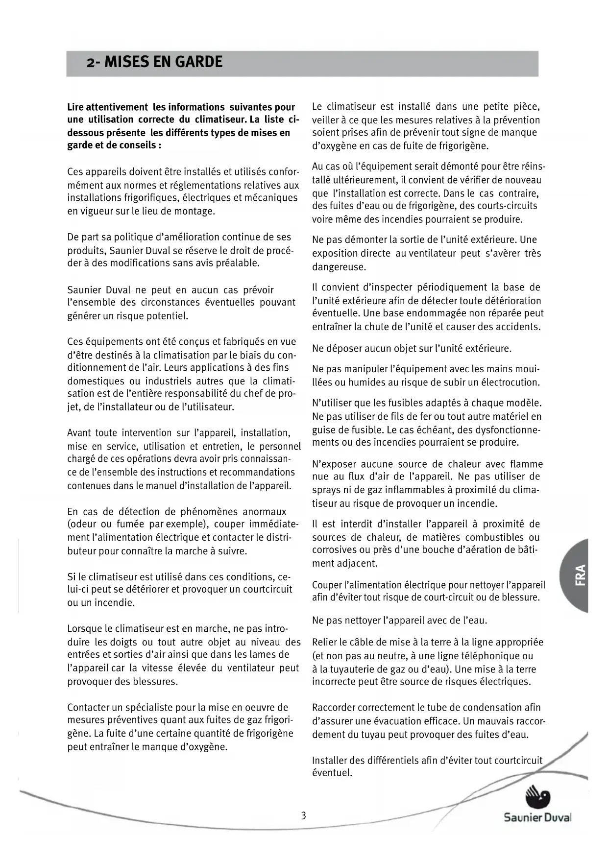 Lire attentivement les informations suivantes pour une utilisation correcte du climatiseur. La liste ci- dessous présente les différents types de mises en garde et de conseils : Ces appareils doivent être installés et utilisés confor- mément aux normes et réglementations relatives aux installations frigorifiques, électriques et mécaniques en vigueur sur le lieu de montage. De part sa politique d’amélioration continue de ses produits, Saunier Duval se réserve le droit de procé- der à des modifications sans avis préalable. Saunier Duval ne peut en aucun cas prévoir l’ensemble des circonstances éventuelles pouvant générer un risque potentiel. Ces équipements ont été conçus et fabriqués en vue d’être destinés à la climatisation par le biais du con- ditionnement de l’air. Leurs applications à des fins domestiques ou industriels autres que la climati- sation est de l’entière responsabilité du chef de pro- jet, de l’installateur ou de l’utilisateur. Avant toute intervention sur l’appareil, installation, mise en service, utilisation et entretien, le personnel chargé de ces opérations devra avoir pris connaissan- ce de l’ensemble des instructions et recommandations contenues dans le manuel d’installation de l’appareil. En cas de détection de phénomènes anormaux (odeur ou fumée par exemple), couper immédiate- ment l’alimentation électrique et contacter le distri- buteur pour connaître la marche à suivre. Si le climatiseur est utilisé dans ces conditions, ce- lui-ci peut se détériorer et provoquer un courtcircuit ou un incendie. Lorsque le climatiseur est en marche, ne pas intro- duire les doigts ou tout autre objet au niveau des entrées et sorties d’air ainsi que dans les lames de l’appareil car la vitesse élevée du ventilateur peut provoquer des blessures. Contacter un spécialiste pour la mise en oeuvre de mesures préventives quant aux fuites de gaz frigori- gène. La fuite d’une certaine quantité de frigorigène peut entraîner le manque d’oxygène. Le climatiseur est installé dans une petite pièce, veiller à ce que les mesures relatives à la prévention soient prises afin de prévenir tout signe de manque d’oxygène en cas de fuite de frigorigène. Au cas où l’équipement serait démonté pour être réins- tallé ultérieurement, il convient de vérifier de nouveau que l’installation est correcte. Dans le cas contraire, des fuites d’eau ou de frigorigène, des courts-circuits voire même des incendies pourraient se produire. Ne pas démonter la sortie de l’unité extérieure. Une exposition directe au ventilateur peut s’avèrer très dangereuse. Il convient d’inspecter périodiquement la base de l’unité extérieure afin de détecter toute détérioration éventuelle. Une base endommagée non réparée peut entraîner la chute de l’unité et causer des accidents. Ne déposer aucun objet sur l’unité extérieure. Ne pas manipuler l’équipement avec les mains moui- llées ou humides au risque de subir un électrocution. N’utiliser que les fusibles adaptés à chaque modèle. Ne pas utiliser de fils de fer ou tout autre matériel en guise de fusible. Le cas échéant, des dysfonctionne- ments ou des incendies pourraient se produire. N’exposer aucune source de chaleur avec flamme nue au flux d’air de l’appareil. Ne pas utiliser de sprays ni de gaz inflammables à proximité du clima- tiseur au risque de provoquer un incendie. Il est interdit d’installer l’appareil à proximité de sources de chaleur, de matières combustibles ou corrosives ou près d’une bouche d’aération de bâti- ment adjacent. Couper l’alimentation électrique pour nettoyer l’appareil afin d’éviter tout risque de court-circuit ou de blessure. Ne pas nettoyer l’appareil avec de l’eau. Relier le câble de mise à la terre à la ligne appropriée (et non pas au neutre, à une ligne téléphonique ou à la tuyauterie de gaz ou d’eau). Une mise à la terre incorrecte peut être source de risques électriques. Raccorder correctement le tube de condensation afin d’assurer une évacuation efficace. Un mauvais raccor- dement du tuyau peut provoquer des fuites d’eau. Installer des différentiels afin d’éviter tout courtcircuit éventuel.54 FRA