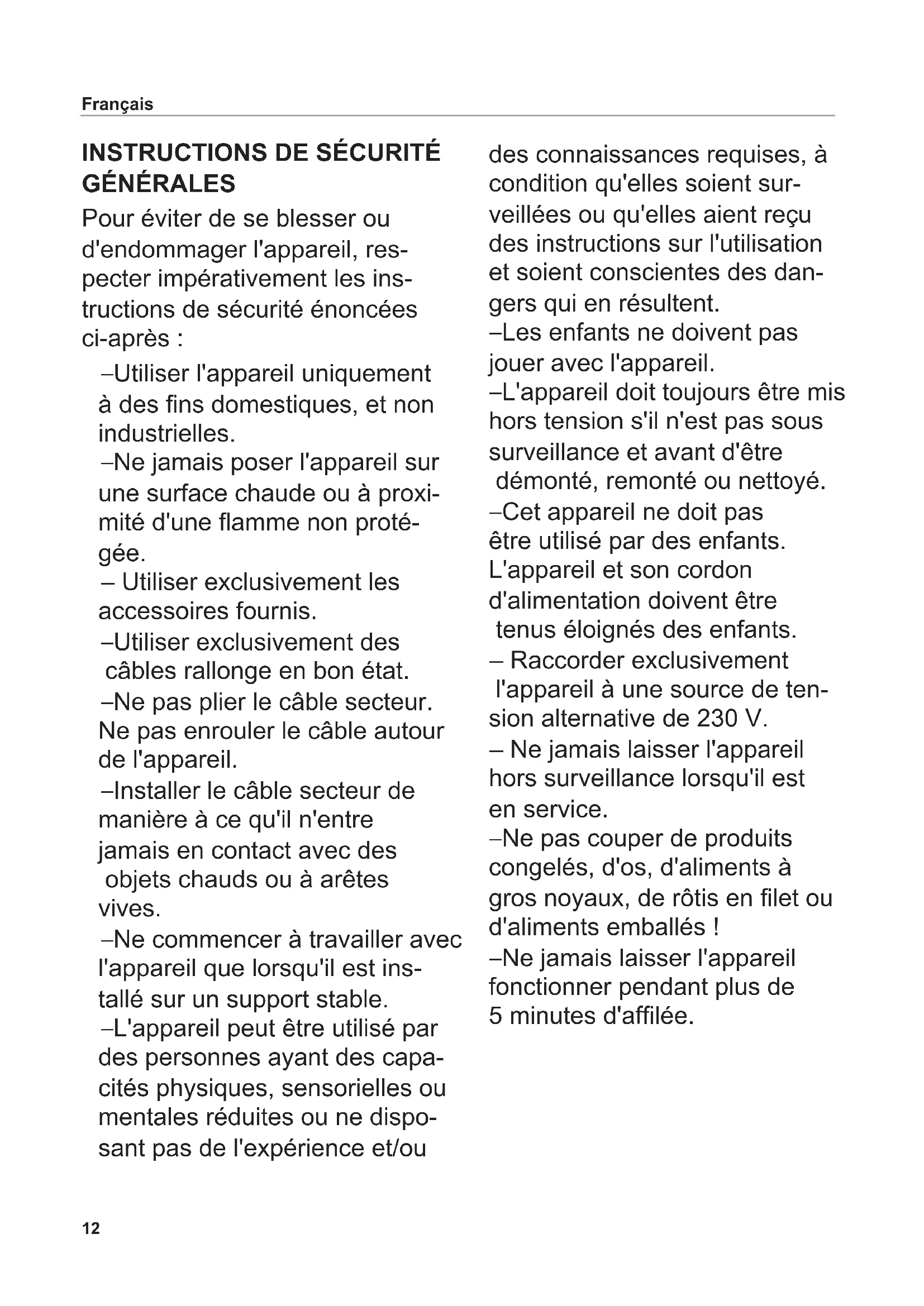 Pour éviter de se blesser ou d'endommager l'appareil, res- pecter impérativement les ins- tructions de sécurité énoncées ci-après : – Utiliser l'appareil uniquement à des ns domestiques, et non industrielles. – Ne jamais poser l'appareil sur une surface chaude ou à proxi- mité d'une amme non proté- gée. – Utiliser exclusivement les accessoires fournis. – Utiliser exclusivement des câbles rallonge en bon état. – Ne pas plier le câble secteur. Ne pas enrouler le câble autour de l'appareil. – Installer le câble secteur de manière à ce qu'il n'entre jamais en contact avec des objets chauds ou à arêtes vives. – Ne commencer à travailler avec l'appareil que lorsqu'il est ins- tallé sur un support stable. – L'appareil peut être utilisé par des personnes ayant des capa- cités physiques, sensorielles ou mentales réduites ou ne dispo- sant pas de l'expérience et/ou des connaissances requises, à condition qu'elles soient sur- veillées ou qu'elles aient reçu des instructions sur l'utilisation et soient conscientes des dan- gers qui en résultent. – Les enfants ne doivent pas jouer avec l'appareil. – L'appareil doit toujours être mis hors tension s'il n'est pas sous surveillance et avant d'être démonté, remonté ou nettoyé. – Cet appareil ne doit pas être utilisé par des enfants. L'appareil et son cordon d'alimentation doivent être tenus éloignés des enfants. – Raccorder exclusivement l'appareil à une source de ten- sion alternative de 230 V. – Ne jamais laisser l'appareil hors surveillance lorsqu'il est en service. – Ne pas couper de produits congelés, d'os, d'aliments à gros noyaux, de rôtis en let ou d'aliments emballés ! – Ne jamais laisser l'appareil fonctionner pendant plus de 5 minutes d'aflée.13 Français Risque de décharge électrique – Débrancher toujours la che secteur de la prise de courant en cas de panne, avant de net- toyer l'appareil ou lorsqu'il n'est pas utilisé. Tirer sur la che et non sur le câble. – Ne jamais plonger l'appareil dans l'eau. Ne pas expo- ser l'appareil à la pluie ou à d'autres sources d'humidité. Si l'appareil devait toutefois tomber dans l'eau, débrancher d'abord la che secteur de la prise de courant, puis sortir l'appareil de l'eau. Faire ensuite vérier l'appareil dans un centre de service après-vente agréé avant de le remettre en marche. – Ne jamais utiliser l'appareil avec des mains humides. Ne pas l'employer lorsqu'il est humide ou mouillé, ou si vous vous trouvez sur un sol humide. Ne pas utiliser l'appa- reil en plein air. – Cesser aussitôt d'utiliser l'appa- reil lorsque certains de ses éléments sont endommagés. Envoyer l'appareil complet au service après-vente ritter. – Si le câble secteur est endom- magé, il doit être remplacé par le fabricant, son service après- vente ou une personne dispo- sant de la qualication requise, an d'exclure tout risque. Risques de blessures – Ne pas utiliser cet appareil sans chariot ou pousse-restes, à moins que la taille et la forme du produit à trancher ne le per- mettent. – Mettre l'appareil hors tension et le débrancher avant de rem- placer des accessoires ou des pièces mobiles en cours de fonctionnement. – La lame est très coupante. – En cours de fonctionnement, ne jamais toucher la lame ! – Avant de nettoyer l'appareil, le mettre hors tension, débran- cher la che secteur de la prise de courant et placer le bouton de réglage de l'épaisseur de coupe en position « 0 ». – La lame continue de tourner quelques instants après la mise hors tension.14 Déplier les graphiques qui se trouvent dans la partie avant et arrière au dos du manuel. Lire attentivement le mode d'emploi avant la mise en service de l'appareil. Conserver le mode d'emploi et le laisser avec l'appa- reil lorsque celui-ci est vendu. USAGE CONFORME La trancheuse universelle permet de couper les produits alimen- taires à usage domestique. Une utilisation non conforme ou inadaptée peut être à l'origine de graves blessures ou endom- mager l'appareil. Les clauses de garantie et la responsabilité du fabricant n'ont plus cours de validité dans ce cas.