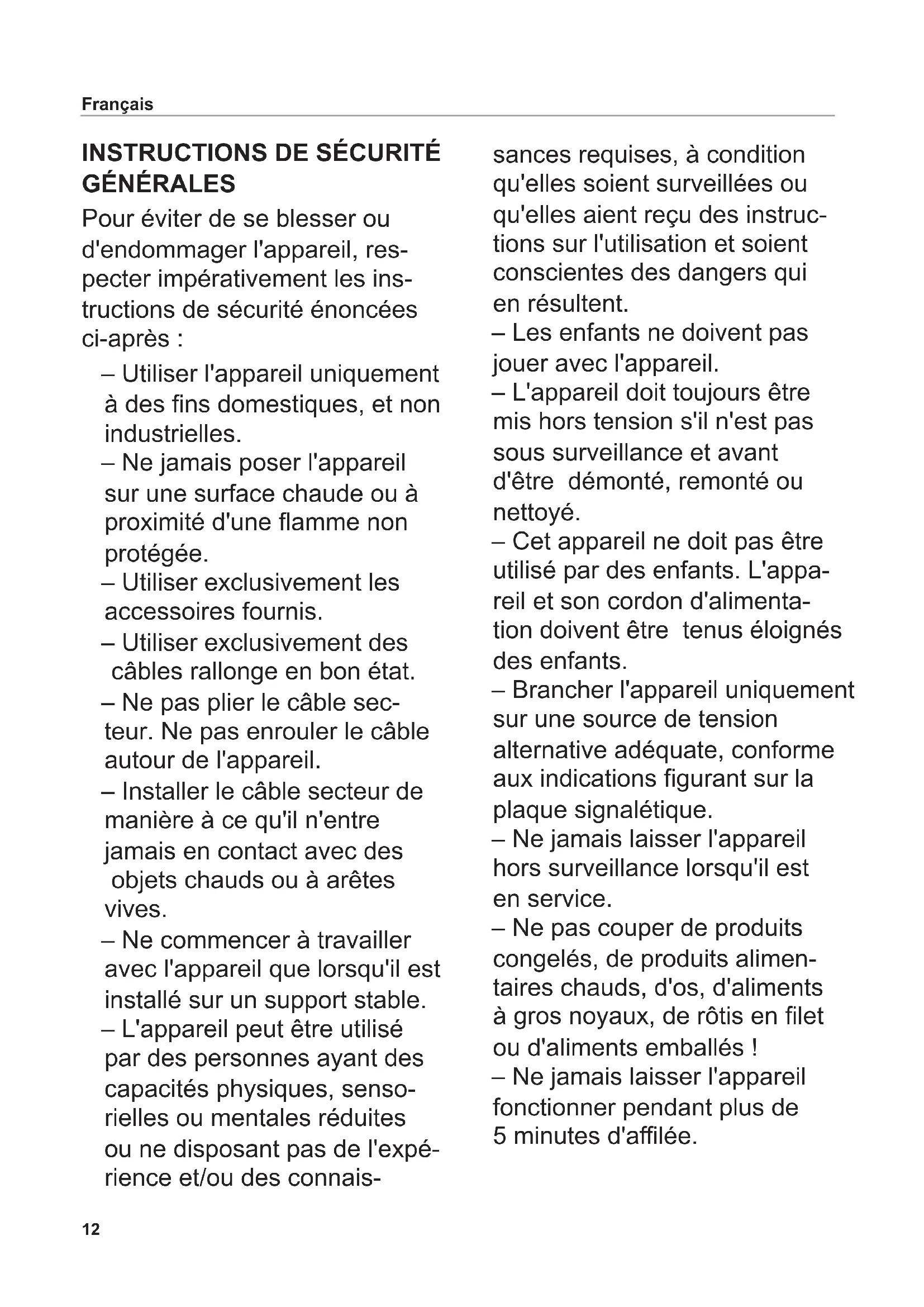 Pour éviter de se blesser ou d'endommager l'appareil, res- pecter impérativement les ins- tructions de sécurité énoncées ci-après : – Utiliser l'appareil uniquement à des ns domestiques, et non industrielles. – Ne jamais poser l'appareil sur une surface chaude ou à proximité d'une amme non protégée. – Utiliser exclusivement les accessoires fournis. – Utiliser exclusivement des câbles rallonge en bon état. – Ne pas plier le câble sec- teur. Ne pas enrouler le câble autour de l'appareil. – Installer le câble secteur de manière à ce qu'il n'entre jamais en contact avec des objets chauds ou à arêtes vives. – Ne commencer à travailler avec l'appareil que lorsqu'il est installé sur un support stable. – L'appareil peut être utilisé par des personnes ayant des capacités physiques, senso- rielles ou mentales réduites ou ne disposant pas de l'expé- rience et/ou des connais- sances requises, à condition qu'elles soient surveillées ou qu'elles aient reçu des instruc- tions sur l'utilisation et soient conscientes des dangers qui en résultent. – Les enfants ne doivent pas jouer avec l'appareil. – L'appareil doit toujours être mis hors tension s'il n'est pas sous surveillance et avant d'être démonté, remonté ou nettoyé. – Cet appareil ne doit pas être utilisé par des enfants. L'appa- reil et son cordon d'alimenta- tion doivent être tenus éloignés des enfants. – Brancher l'appareil uniquement sur une source de tension alternative adéquate, conforme aux indications gurant sur la plaque signalétique. – Ne jamais laisser l'appareil hors surveillance lorsqu'il est en service. – Ne pas couper de produits congelés, de produits alimen- taires chauds, d'os, d'aliments à gros noyaux, de rôtis en let ou d'aliments emballés ! – Ne jamais laisser l'appareil fonctionner pendant plus de 5 minutes d'alée.13 Français Risque de décharge électrique – Débrancher toujours la che secteur de la prise de courant en cas de panne, avant de nettoyer l'appareil ou lorsqu'il n'est pas utilisé. Tirer sur la che et non sur le câble. – Ne jamais plonger l'appareil dans l'eau. Ne pas expo- ser l'appareil à la pluie ou à d'autres sources d'humidité. Si l'appareil devait toutefois tomber dans l'eau, débrancher d'abord la che secteur de la prise de courant, puis sortir l'appareil de l'eau. Faire ensuite vérier l'appareil dans un centre de service après-vente agréé avant de le remettre en marche. – Ne jamais utiliser l'appareil avec des mains humides. Ne pas l'employer lorsqu'il est humide ou mouillé, ou si vous vous trouvez sur un sol humide. Ne pas utiliser l'appa- reil en plein air. – Cesser aussitôt d'utiliser l'appareil lorsque certains de ses éléments sont endom- magés et contacter le service après-vente ritter. – Si le câble secteur est endom- magé, il doit être remplacé par le fabricant, son service après- vente ou une personne dispo- sant de la qualication requise, an d'exclure tout risque. Risques de blessures – Ne pas utiliser cet appareil sans chariot ou pousse-restes, à moins que la taille et la forme du produit à trancher ne le permettent. – Mettre l'appareil hors tension et le débrancher avant de remplacer des accessoires ou des pièces mobiles en cours de fonctionnement. – La lame est très coupante. – En cours de fonctionnement, ne jamais toucher la lame ! – Avant de nettoyer l'appareil, le mettre hors tension, débran- cher la che secteur de la prise de courant et placer le bouton de réglage de l'épaisseur de coupe en position « 0 ». – La lame continue de tourner quelques instants après la mise hors tension.14 Déplier les graphiques qui se trouvent dans la partie avant et arrière au dos du manuel. Lire attentivement le mode d'emploi avant la mise en service de l'appareil. Conserver le mode d'emploi et le laisser avec l'appa- reil lorsque celui-ci est vendu. La dernière version du mode d'emploi est également dispo- nible sous www.ritterwerk.de. USAGE CONFORME La trancheuse universelle permet de couper les produits alimen- taires à usage domestique. La trancheuse universelle est conçue pour le contact avec les denrées alimentaires. Une utilisation non conforme ou inadaptée peut être à l'origine de graves blessures ou endom- mager l'appareil. Les clauses de garantie et la responsabilité du fabricant n'ont plus cours de validité dans ce cas.