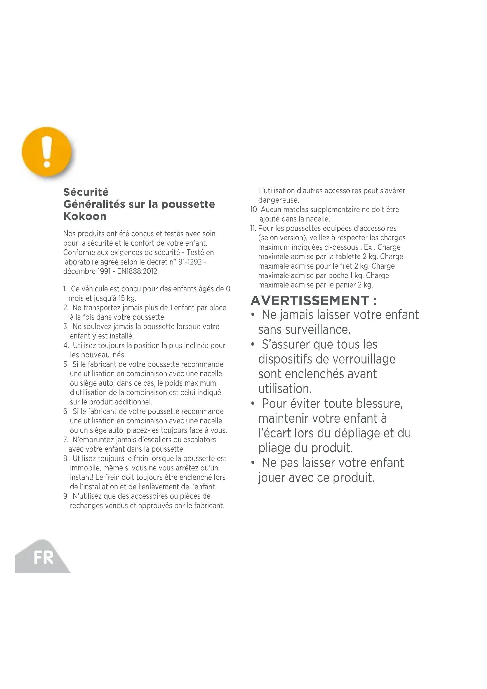 Sécurité Généralités sur la poussette Kokoon Nos produits ont été conçus et testés avec soin pour la sécurité et le confort de votre enfant. Conforme aux exigences de sécurité - Testé en laboratoire agréé selon le décret n° 91-1292 - décembre 1991 - EN1888:2012.