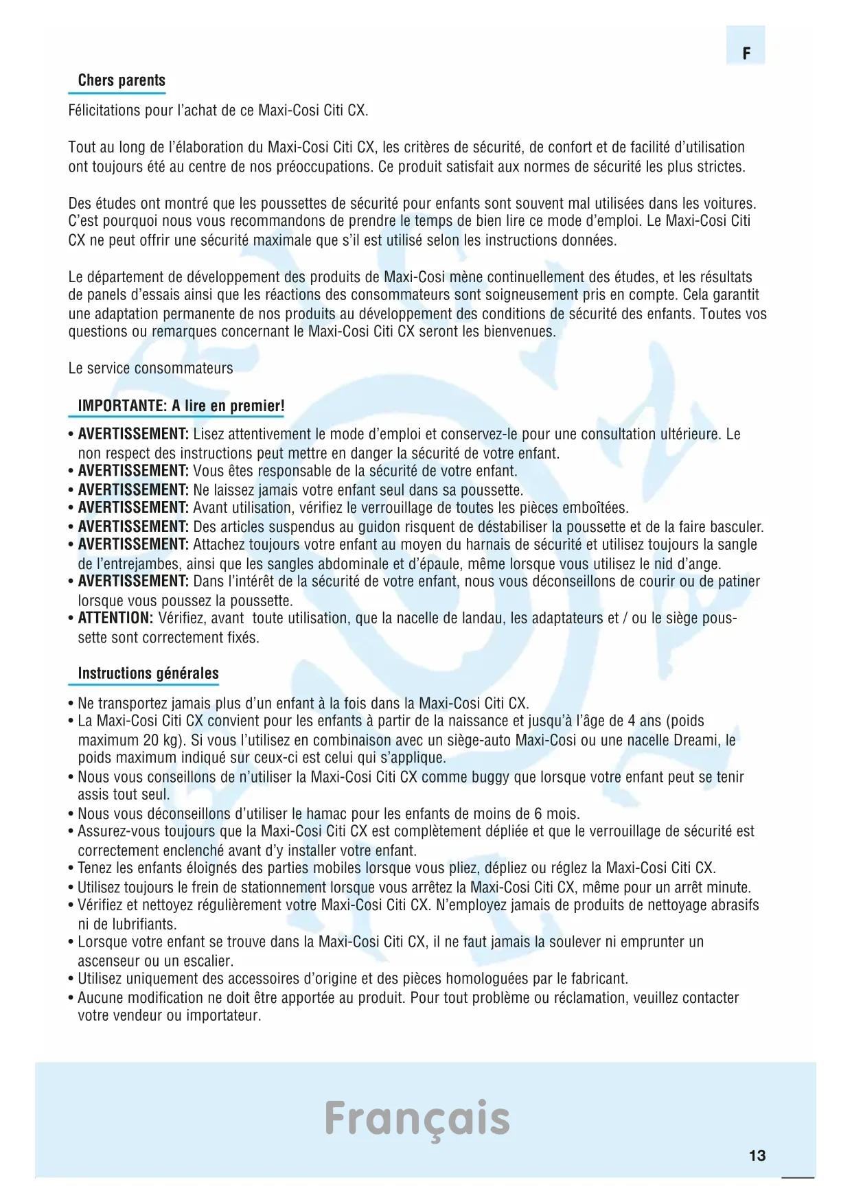 WarrantyChers parents Félicitations pour l’achat de ce Maxi-Cosi Citi CX. Tout au long de l’élaboration du Maxi-Cosi Citi CX, les critères de sécurité, de confort et de facilité d’utilisation ont toujours été au centre de nos préoccupations. Ce produit satisfait aux normes de sécurité les plus strictes. Des études ont montré que les poussettes de sécurité pour enfants sont souvent mal utilisées dans les voitures. C’est pourquoi nous vous recommandons de prendre le temps de bien lire ce mode d’emploi. Le Maxi-Cosi Citi CX ne peut offrir une sécurité maximale que s’il est utilisé selon les instructions données. Le département de développement des produits de Maxi-Cosi mène continuellement des études, et les résultats de panels d’essais ainsi que les réactions des consommateurs sont soigneusement pris en compte. Cela garantit une adaptation permanente de nos produits au développement des conditions de sécurité des enfants. Toutes vos questions ou remarques concernant le Maxi-Cosi Citi CX seront les bienvenues. Le service consommateurs IMPORTANTE: A lire en premier!