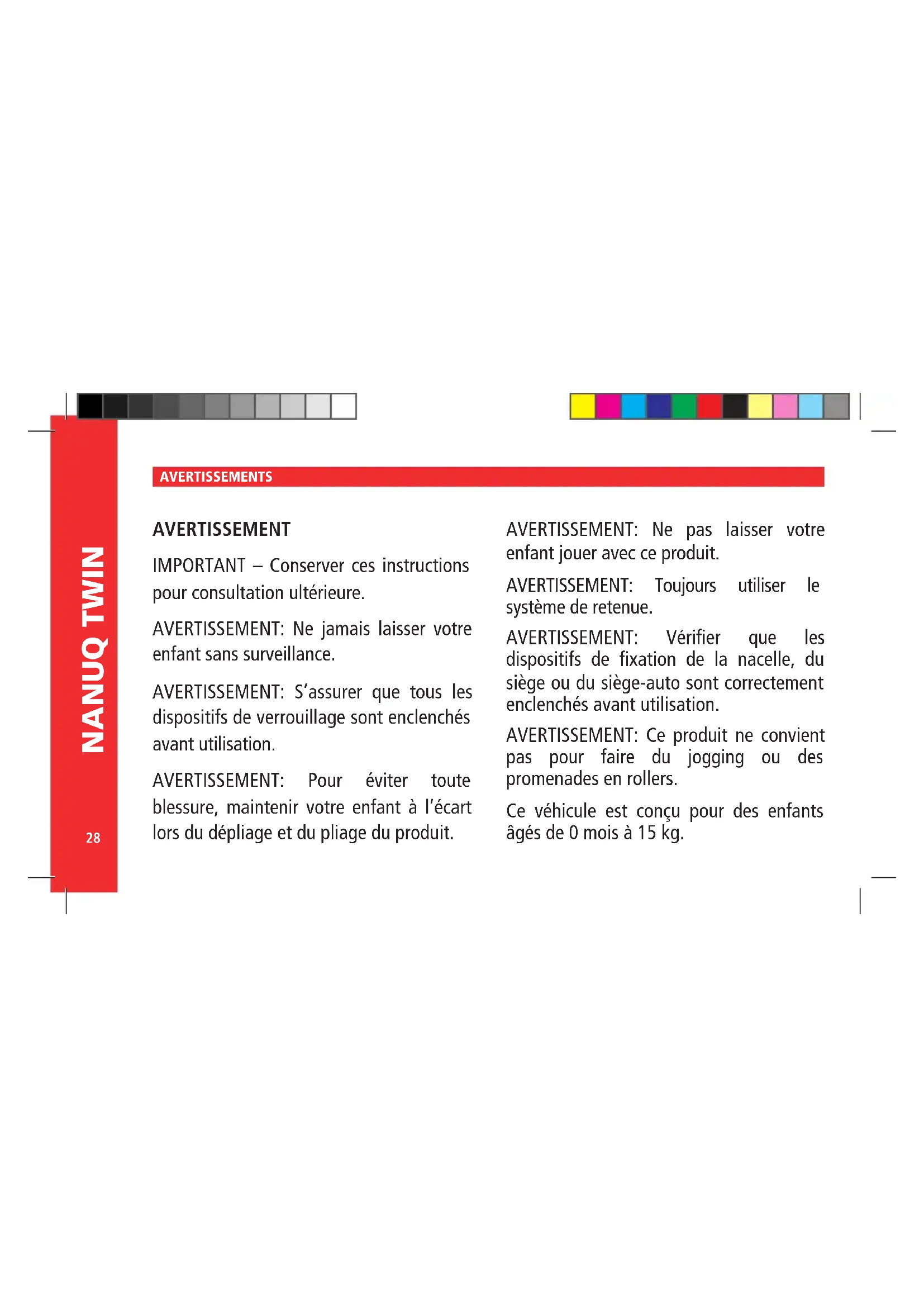 pas pour faire du jogging ou des promenades en rollers. Ce véhicule est conçu pour des enfants âgés de 0 mois à 15 kg.français