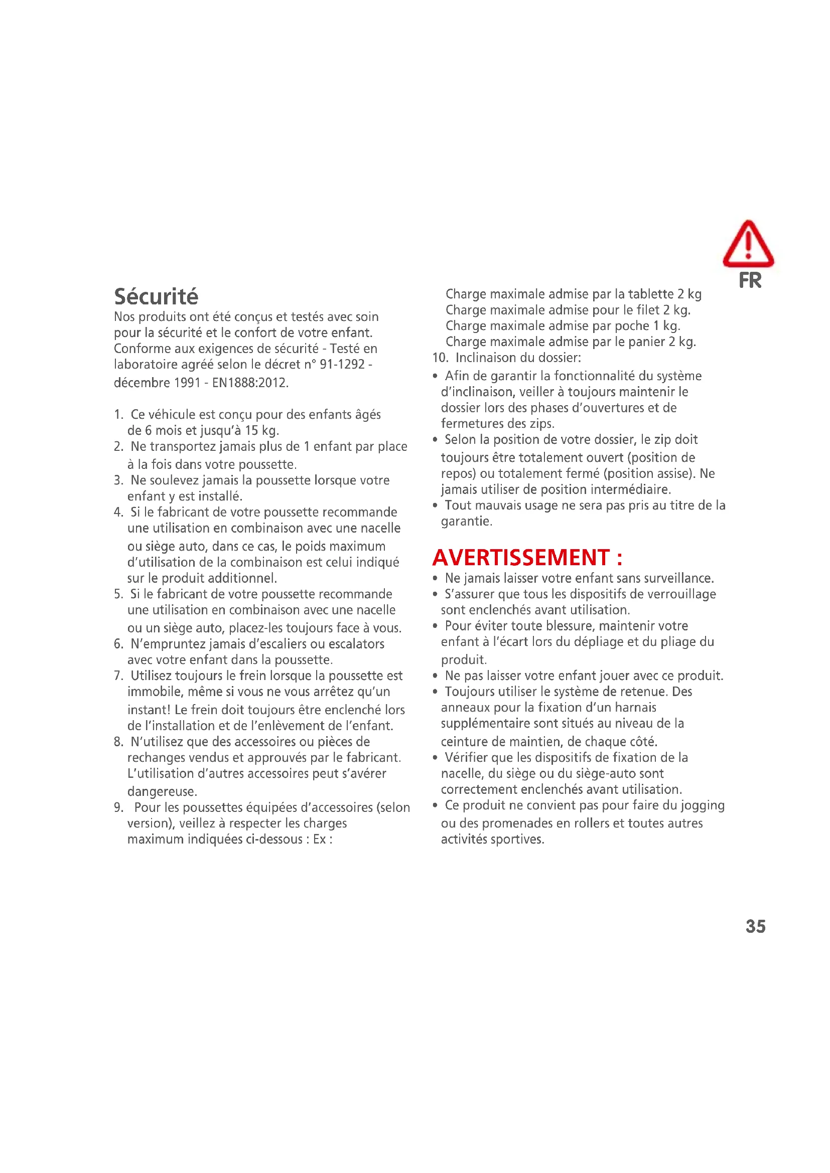 Sécurité Nos produits ont été conçus et testés avec soin pour la sécurité et le confort de votre enfant. Conforme aux exigences de sécurité - Testé en laboratoire agréé selon le décret n° 91-1292 - décembre 1991 - EN1888:2012.