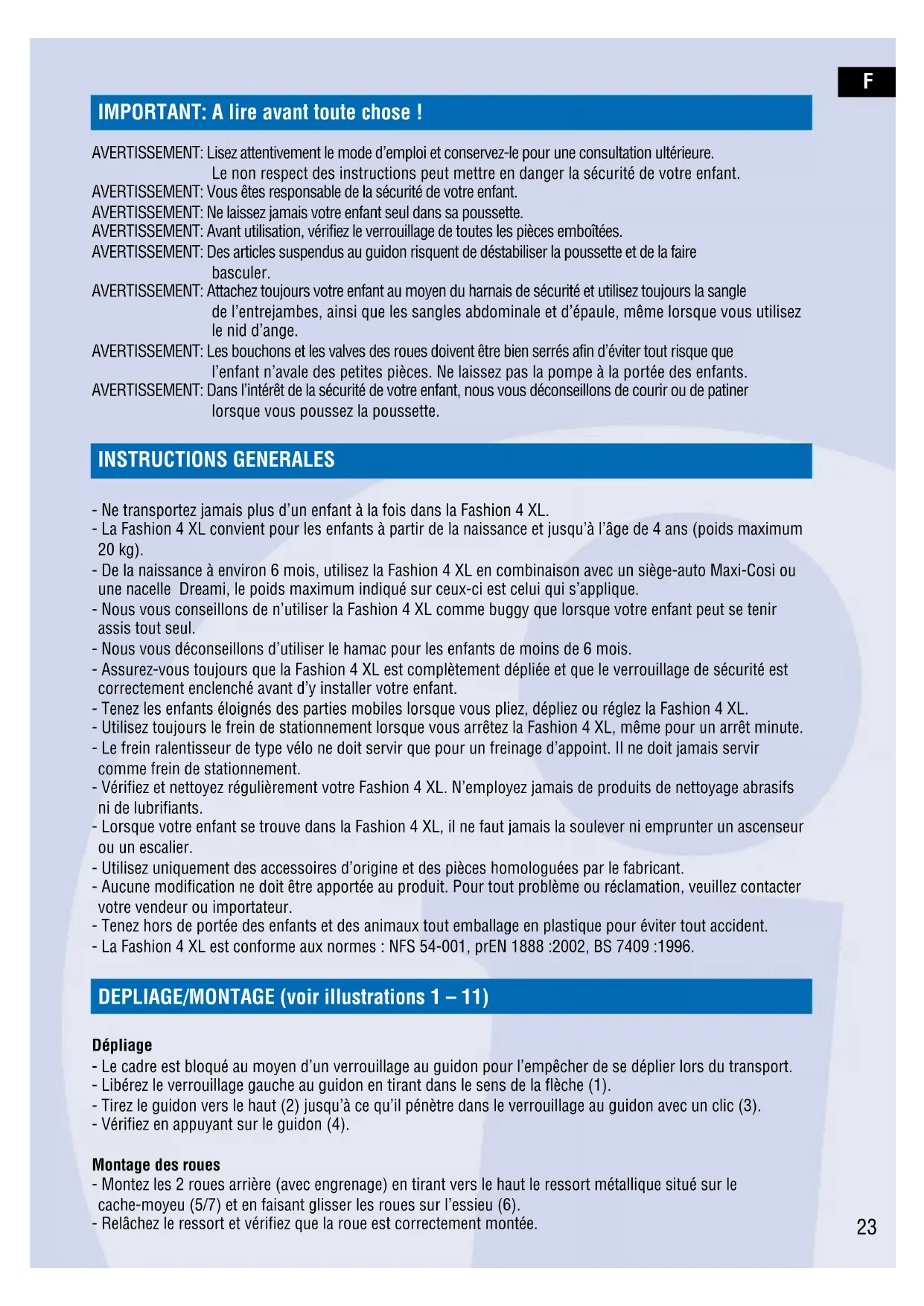 lorsque vous poussez la poussette. INSTRUCTIONS GENERALES - Ne transportez jamais plus d’un enfant à la fois dans la Fashion 4 XL. - La Fashion 4 XL convient pour les enfants à partir de la naissance et jusqu’à l’âge de 4 ans (poids maximum 20 kg). - De la naissance à environ 6 mois, utilisez la Fashion 4 XL en combinaison avec un siège-auto Maxi-Cosi ou une nacelle Dreami, le poids maximum indiqué sur ceux-ci est celui qui s’applique. - Nous vous conseillons de n’utiliser la Fashion 4 XL comme buggy que lorsque votre enfant peut se tenir assis tout seul. - Nous vous déconseillons d’utiliser le hamac pour les enfants de moins de 6 mois. - Assurez-vous toujours que la Fashion 4 XL est complètement dépliée et que le verrouillage de sécurité est correctement enclenché avant d’y installer votre enfant. - Tenez les enfants éloignés des parties mobiles lorsque vous pliez, dépliez ou réglez la Fashion 4 XL. - Utilisez toujours le frein de stationnement lorsque vous arrêtez la Fashion 4 XL, même pour un arrêt minute. - Le frein ralentisseur de type vélo ne doit servir que pour un freinage d’appoint. Il ne doit jamais servir comme frein de stationnement. - Vérifiez et nettoyez régulièrement votre Fashion 4 XL. N’employez jamais de produits de nettoyage abrasifs ni de lubrifiants. - Lorsque votre enfant se trouve dans la Fashion 4 XL, il ne faut jamais la soulever ni emprunter un ascenseur ou un escalier. - Utilisez uniquement des accessoires d’origine et des pièces homologuées par le fabricant. - Aucune modification ne doit être apportée au produit. Pour tout problème ou réclamation, veuillez contacter votre vendeur ou importateur. - Tenez hors de portée des enfants et des animaux tout emballage en plastique pour éviter tout accident. - La Fashion 4 XL est conforme aux normes : NFS 54-001, prEN 1888 :2002, BS 7409 :1996. DEPLIAGE/MONTAGE (voir illustrations 1 – 11) Dépliage - Le cadre est bloqué au moyen d’un verrouillage au guidon pour l’empêcher de se déplier lors du transport. - Libérez le verrouillage gauche au guidon en tirant dans le sens de la flèche (1). - Tirez le guidon vers le haut (2) jusqu’à ce qu’il pénètre dans le verrouillage au guidon avec un clic (3). - Vérifiez en appuyant sur le guidon (4). Montage des roues - Montez les 2 roues arrière (avec engrenage) en tirant vers le haut le ressort métallique situé sur le cache-moyeu (5/7) et en faisant glisser les roues sur l’essieu (6). - Relâchez le ressort et vérifiez que la roue est correctement montée.F - Si la roue ne glisse pas complètement sur l’essieu, poussez vers le bas la barre de frein du guidon. - Montez les roues avant. - Vérifiez la pression des pneus et gonflez-les si nécessaire (vous trouverez la pression maximum des pneus dans la section entretien). Démontage des roues - Démontez les roues arrière en tirant vers le haut le ressort métallique situé sur le cache-moyeu (5/7) et en retirant les roues de l’essieu (8). Fixation du guidon - Faites glisser le guidon muni de sa barre de frein sur l’extrémité des montants du châssis ; enfoncez les deux loquets à ressort et assurez-vous qu’ils s’enclenchent parfaitement (vous devrez entendre un clic) dans la partie du guidon en plastique noir. - Assurez-vous que les câbles de frein ne sont pas tordus et qu’ils sont bien parallèles au guidon. - Réglez le guidon dans la position souhaitée en poussant simultanément sur les deux boutons de réglage de chaque côté (4.1-4.2). Pliage - Repliez le pare-soleil (voir “Montage/démontage du pare-soleil”). - Placez le dossier du hamac en position inclinée (voir “Réglage du dossier”). - Placez le repose-pieds en position haute (voir “Repose-pieds”). - Repoussez le bloque-châssis sur la manette de verrouillage du montant droit du guidon (9). - Tirez vers le haut les manettes de verrouillages des montants gauche et droit du guidon et poussez le guidon vers l’avant pour replier la Fashion 4 XL (10). - Assurez-vous que le système de verrouillage du guidon s’enclenche bien dans le système de verrouillage permettant de faciliter le transport (vous devrez entendre un clic) (11). - Pour un encombrement minimum, retirez les roues et le hamac (voir “Fixation du hamac”). FREIN DE STATIONNEMENT (voir illustration 12) Utilisez toujours ce frein pour arrêter la Fashion 4 XL, même pour un arrêt minute. - La Fashion 4 XL est équipée d’un frein de stationnement automatique. Pour freiner, relâchez la barre de frein (12) sur le guidon. Pour rouler, maintenez enfoncée la barre de frein. Le frein de stationnement s’enclenche lorsque vous relâchez la barre de frein. - IL NE FAUT JAMAIS rien accrocher à la barre de frein. Cela relâcherait les freins et la sécurité de la Fashion 4 XL ne serait plus assurée. Le frein à main ne sert que comme ralentisseur et ne doit pas être utilisé comme frein de stationnement. Vérifiez toujours que les roues sont bloquées. UTILISATION Utilisation avec la nacelle Dreami (jusqu’à 9 kg) et le siège-auto Maxi-Cosi (jusqu’à 13 kg) (voir illustrations 13 – 19) Fixation des adaptateurs - Retirez d’abord les caches-adaptateurs en déplaçant vers l’extérieur le bouton rouge sous les connecteurs des adaptateurs, et en poussant les caches vers le haut (13). - Faites glisser l’adaptateur A dans le côté droit du logement et l’adaptateur B dans le côté gauche du logement. - Continuez à les faire glisser jusqu’à entendre un clic (14). - Vérifiez que les adaptateurs sont bien en place. 24F