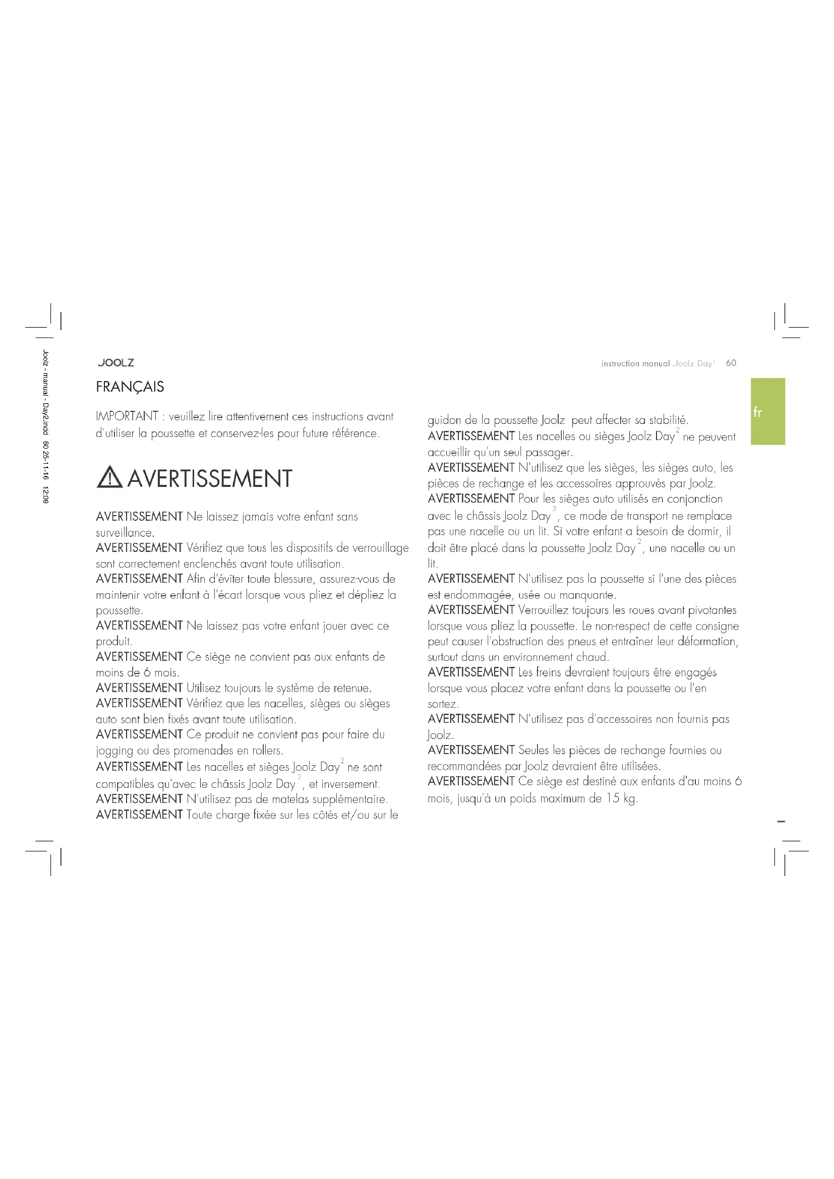 IMPORTANT: veuillez lire attentivement ces instructions avant d'utiliser la poussette et conservez-les pour future référence. AVERTISSEMENT AVERTISSEMENT Ne laissez jamais votre enfant sans surveillance. AVERTISSEMENT Vérifiez que tous les dispositifs de verrouillage sont correctement enclenchés avant toute utilisation. AVERTISSEMENT Afin d'éviter toute blessure, assurez-vous de maintenir votre enfant à l'écart lorsque vous pliez et dépliez la poussette. AVERTISSEMENT Ne laissez pas votre enfant jouer avec ce produit. AVERTISSEMENT Ce siège ne convient pas aux enfants de moins de 6 mois. AVERTISSEMENT Utilisez toujours le système de retenue. AVERTISSEMENT Vérifiez que les nacelles, sièges ou sièges auto sont bien fixés avant toute utilisation. AVERTISSEMENT Ce produit ne convient pas pour faire du jogging ou des promenades en rollers. AVERTISSEMENT Les nacelles et sièges Joolz Day