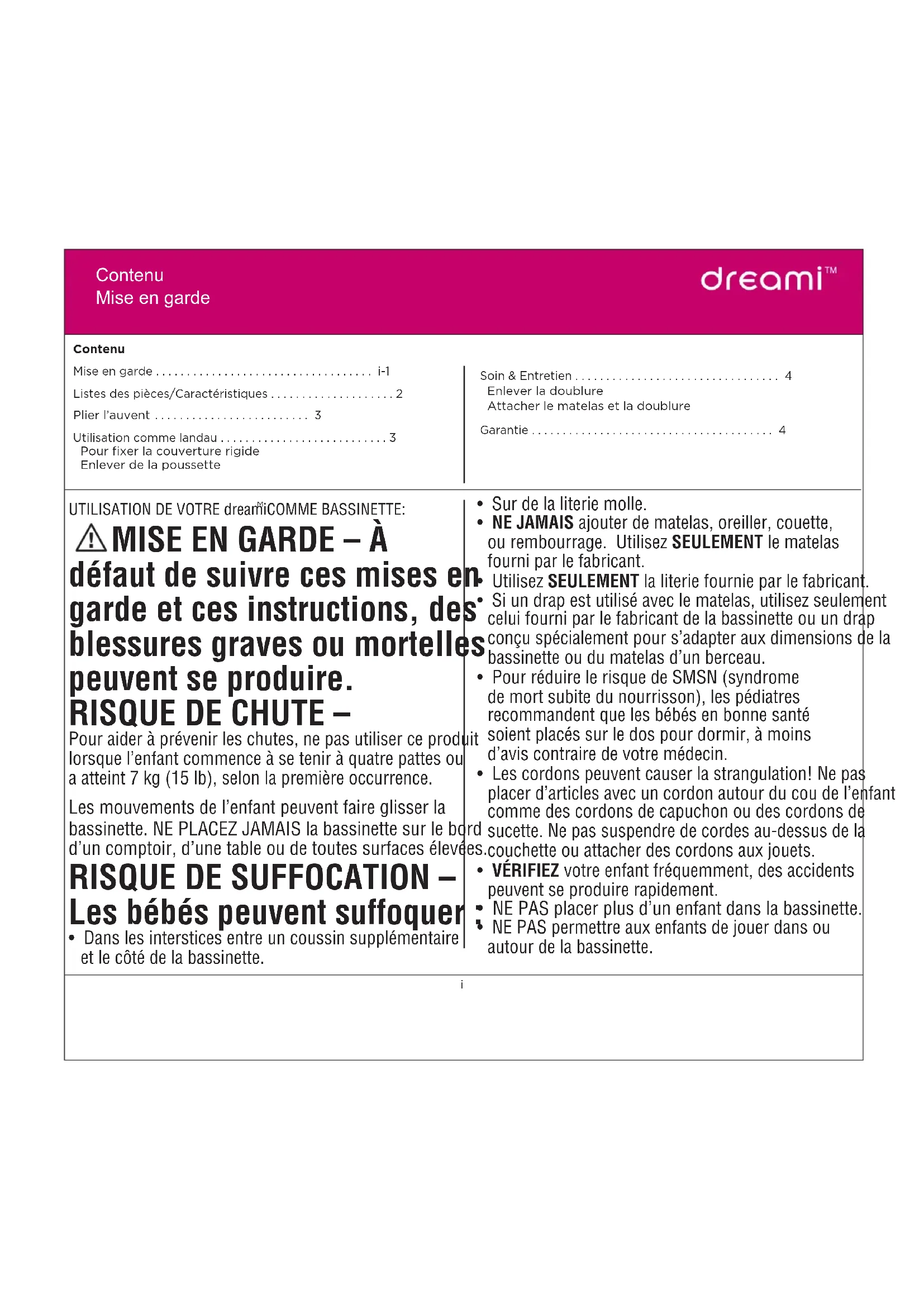 - NE PAS permettre aux enfants de jouer dans ou autour de la bassinette. Soin & Entretien . . . . . . . . . . . . . . . . . . . . . . . . . . . . . . . . . 4 Enlever la doublure Attacher le matelas et la doublure Garantie . . . . . . . . . . . . . . . . . . . . . . . . . . . . . . . . . . . . . . . 4Liste de pièces / Caractéristiques Mise en garde Soin & Entretien Garantie Mode d’emploi Contenu Mise en garde Utilisation du moustiquaire et de la housse contre la pluie Mode d’emploi