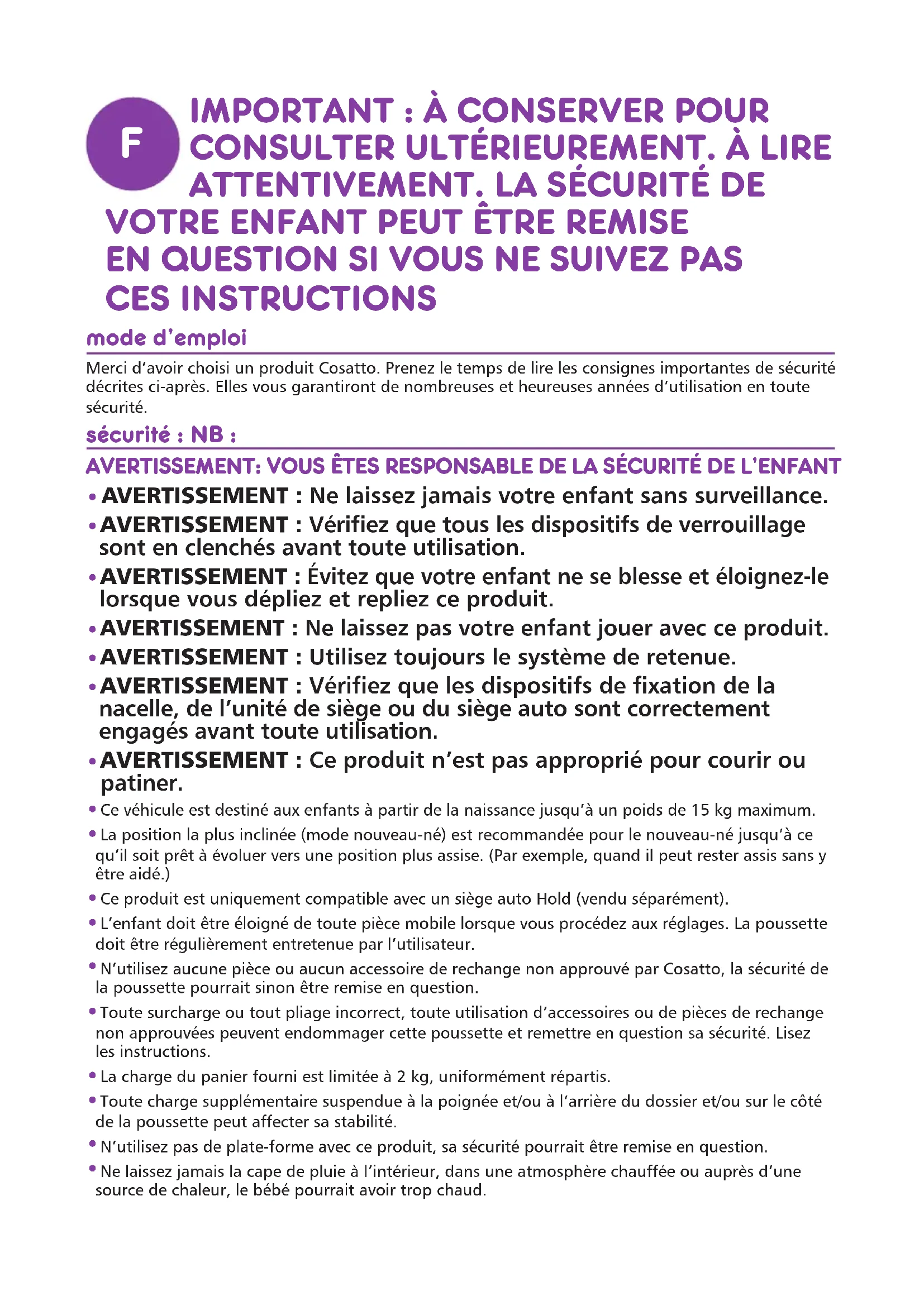 EN QUESTION SI VOUS NE SUIVEZ PAS CES INSTRUCTIONS mode d’emploi Merci d’avoir choisi un produit Cosatto. Prenez le temps de lire les consignes importantes de sécurité décrites ci-après. Elles vous garantiront de nombreuses et heureuses années d’utilisation en toute sécurité. sécurité : NB :