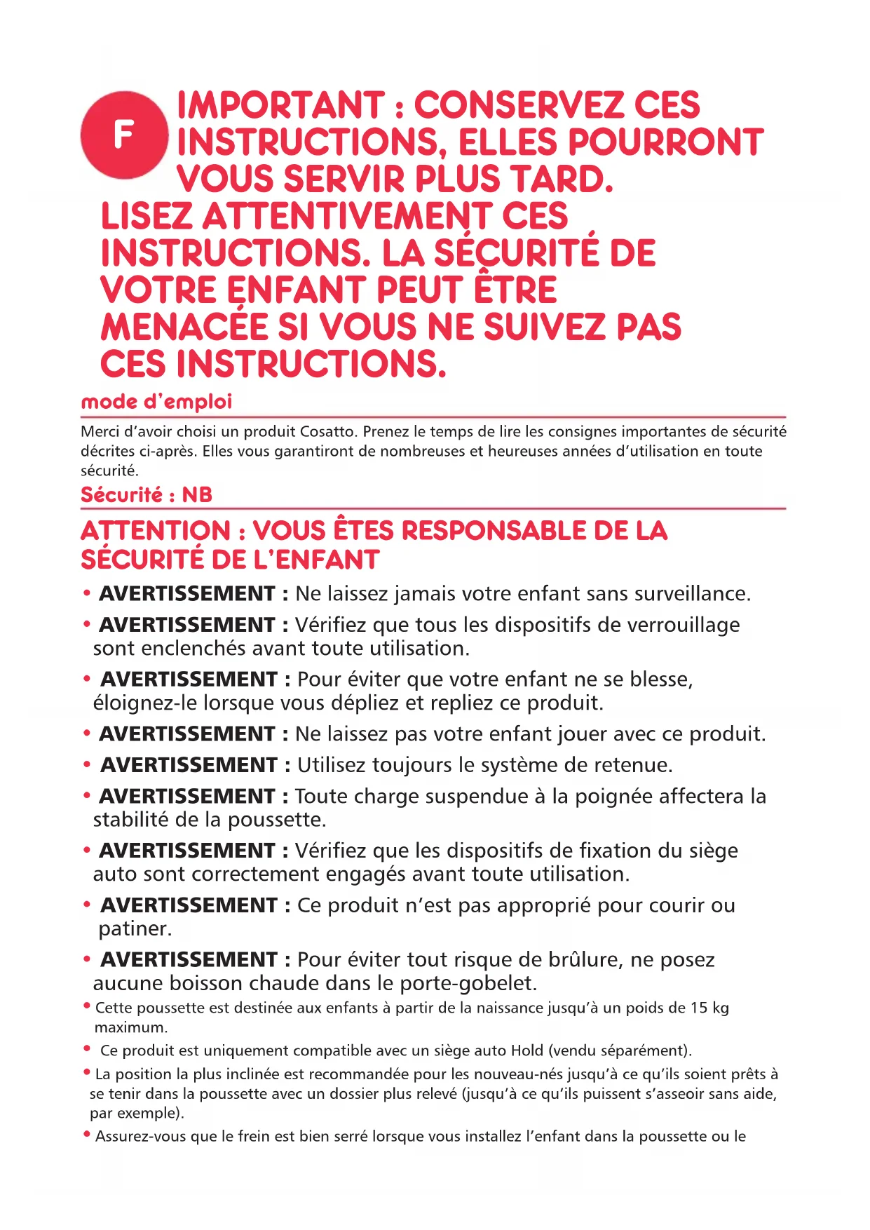 MENACÉE SI VOUS NE SUIVEZ PAS CES INSTRUCTIONS. mode d’emploi Merci d’avoir choisi un produit Cosatto. Prenez le temps de lire les consignes importantes de sécurité décrites ci-après. Elles vous garantiront de nombreuses et heureuses années d’utilisation en toute sécurité. Sécurité : NB