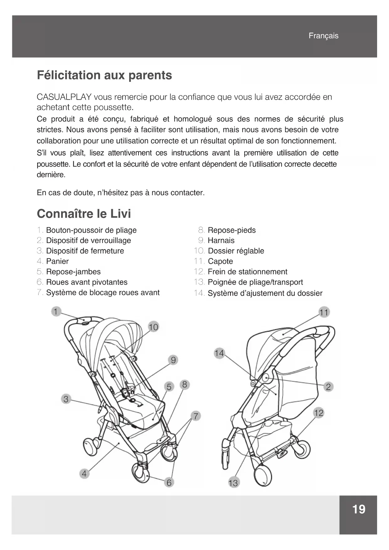 - Do not use accessories that have not been approved by the manufacturer.19 Félicitation aux parents CASUALPLAY vous remercie pour la conance que vous lui avez accordée en achetant cette poussette. Ce produit a été conçu, fabriqué et homologué sous des normes de sécurité plus strictes. Nous avons pensé à faciliter sont utilisation, mais nous avons besoin de votre collaboration pour une utilisation correcte et un résultat optimal de son fonctionnement. S’il vous plaît, lisez attentivement ces instructions avant la première utilisation de cette poussette. Le confort et la sécurité de votre enfant dépendent de l’utilisation correcte decette dernière. En cas de doute, n’hésitez pas à nous contacter. Connaître le Livi